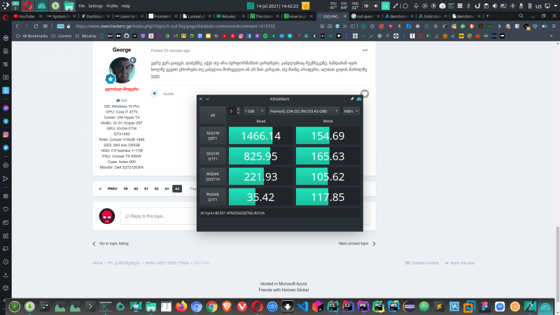 იმედია ასე მალე არ მოკვდება, სულ 2-3 წელია რაც მაქვს ეს ლეპტოპი smartctl სერვისმა ეს ერორი ამოაგდო და ეს მაფიქრებს === START OF SMART DATA SECTION === SMART overall-health self-assessment test result: FAILED! - NVM subsystem reliability has been degraded ესენი ტესტებია, ლინუქსზე ეს ორი უტილიტა არის შედარებით ზუსტი როგორც ვიცი: KDiskMark: sudo hdparm -tT /dev/nvme0n1: /dev/nvme0n1: Timing cached reads: 16562 MB in 2.00 seconds = 8296.72 MB/sec Timing buffered disk reads: 2114 MB in 3.00 seconds = 704.15 MB/sec