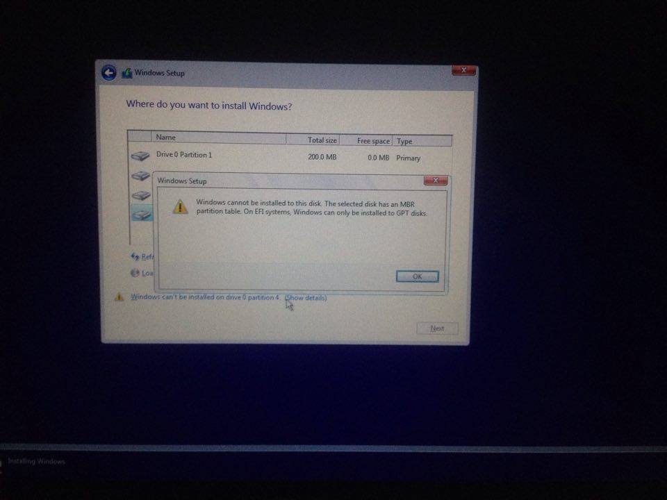 გამარაჯობა მე ძალიან მჩირდება მაკზე ვინდოუსი ყველაფერი bootcamp assistantit გავაკეთე თუმცა სეტუპ სცრინზე როდესაც ვაჩერ ფორმატს ამ ერორს მიგდებს 'windows cant be installed on this disk the selected disk has an MBR partition table on EFI systems, windows can only be installed on GPT disks'' ვინდოუს 10 ის დაყენებას ვცდილობ გთხოვთ იქნებ დამეხმაროთ მადლობა სურათებზე როგორც არის თუ ბოოტცამპიტ ვარესტარტეტბ სჰავ ეკრანს მიგდებს და ტსერია no bootable device ამიტომაც ალტით შევდივარ ფლეშკაზე რითიც სეთუპ ი იხსნება თუმცა ფორმატს რომ ვაჩერ ამ ორი ტიპის ერორს მიგდებს error
