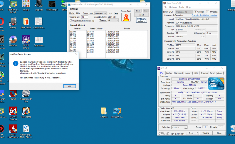 წარმატებით გაიტესტა 350-ზე. რამდენიმე შეკიტხვა მაქვს კიდევ და მერე აღარ შეგაწყენ თავს. თუ კი დედა პლატას ან ჩიპსეტებს ვოლტაჟს არ მოვუმატებ, პროცესორის რაზგონის მიუხედავად მას არანაირი პრობლემა არ შეექმნება და არ გახურდება უფრო მეტად არა? და კიდევ 1 შეკითხვა. ინტელის ოფიციალურ საიტზე Q8300-ს TCASE 71.4°C უწერია და როგორც სურათზე ხედავ ბირთვები 84 75 77 და 79 გრადუსებზე ავიდა. როგორ ფიქრობ ამის გამო ქულერი გამოსაცვლელი მექნება?