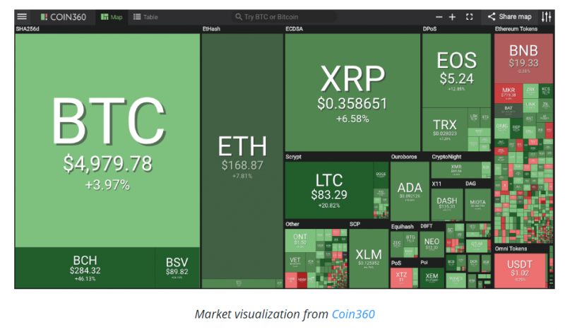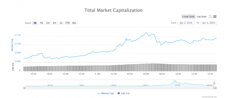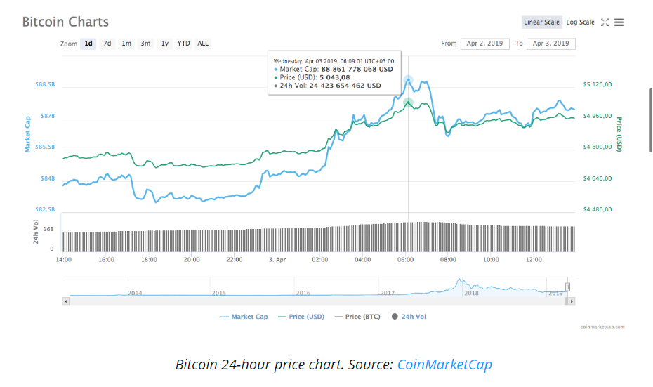 3 აპრილი, ოთხშაბათი. Bitcoin-მა პირველად 2018 წლის ნოემბრის შემდეგ დააფიქსირა ნიშნული 5 ათას დოლარზე. იმ დროს, როდესაც ზოგიერთ კრიპტოვალუტაზე ფასის კლება შეიმჩნევა, დანარჩენებს შეუძლიათ თავი მოიწონონ მზარდი ტენდენციით. BTC-მა 24 საათს განმავლობაში 14%-ზე მეტით მოიმატა და და გადააჭარბა 5 ათასდოლარიან ნიშნულს. CoinMarketCap-ის სტატისტიკის თანახმად, ლიდერმა მონეტამ გარკვეულ მომენტში 5 043 დოლარს მიაღწია, შემდეგ კი დაუბრუნდა 4900 დოლარს. სტატიის წერის მომენტში BTC დაახლოებით 5007 დოლარად იყიდებოდა. Bitcoin-ის ბაზრის კაპიტალიზაცია 1 მლრდ დოლარზე მეტით გაიზარდა წინა დღის მაჩვენებელთან შედარებით. ფასის მატების პიკში BTC-ის ბაზრის კაპიტალიზაციის მაჩვენებელი დაახლოებით 88 მლრდ დოლარი იყო, ამ დროისთვის კი (წერის მომენტში) დაახლოებით 87,4 მილიარდს შეადგენს. Ethereum (ETH), ამ დროისათვის ბაზრის კაპიტალიზაციის სიდიდით მეორე კრიპტოვალუტა, 3 აპრილის მაჩვენებლით 24 საათში 10%-ით გაიზარდა. წინა დღეს, სამშაბათს მისი ფასი დაახლოებით 150 დოლარი იყო, ოთხშაბათს კი იგი 165 დოლარს ზემოთ იყიდებოდა. ETH-ის ბაზრის კაპიტალიზაცია თითქმის 2 მლრდ დოლარით გაიზარდა და შეადგინა 17,6 მილიარდი. რიგით მესამე კრიპტოვალუტა Ripple (XRP) აგრთვე ზრდას განიცდის მესამე დღეა ზედიზედ. მონეტის ფასი 5 საათში 5%-ით გაიზარდა. მისი ბაზრის კაპიტალიზაციის მაჩვენებელი კი 1 მილიარდით მეტია წინა დღესთან შედარებით - 14,7 მილიარდზე მეტი. ყველა კრიპტოვალუტის საერთო ბაზრის კაპიტალიზაციაც მნიშვნელოვნად გაიზარდა 2 აპრილთან შედარებით. 3 აპრილს დაფიქსირებული ყველაზე მაღალი მაჩვენებელი იყო 176,9 მლრდ აშშ დოლარი და იგი სტატიის წერის მომენტში ჩამოვიდა 173,8 მილიარდამდე. რაც შეეხება სხვა Altcoin-ებს, ყველა მთავარი ვალუტა, Maker-ისა (MKR) და Tezos-ის (XTZ) გარდა, მწვანე ზონაში იმყოფება და მათზე შესამჩნევია მზარდი ტენდენცია ბოლო 24 საათის განმავლობაში. Bitcoin Cash (BCH) 280 დოლარს ზემოთ ავიდა - გაიზარდა დაახლოებით 50%-ით. კიდევ ერთი მსხვილი მოთამაშეა LTC, რომელიც ერთ დღეში 20%-ით გაიზარდა და ამჟამად 84 აშშ დოლარად იყიდება. ილონ მასკის განცხადების შემდეგ, რომ Dogecoin (DOGE) მის ფავორიტ კრიპტოვალუტას წარმოადგენს, ხსენებულმა მონეტამ მნიშვნელოვანი ცვლილება განიცადა და გაძვირდა 30%-ით. კრიპტო ბაზრის აღდგენა, რომელიც 1 აპრილს დაიწყო, ფართოდ განიხილება კრიპტო-ქომიუნითებსა და ფინანსების სამყაროში. კრიპტო-ინსაიდერების ქომიუნითი აცხადებს, რომ ამ ნახტომს რაიმე განსაკუთრებული მიზეზი არ გააჩნია და ყველაფერი აიხსნება სპეკულაციებით. Binance-ის გენერალური დირექტორი Changpeng Zhao, ასევე ცნობილი როგორც CZ, აცხადებს, რომ მან არაფერი იცის მომხდარის რე