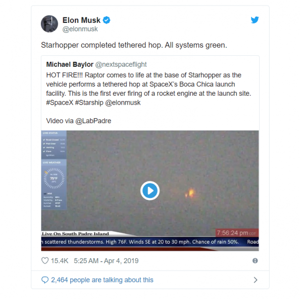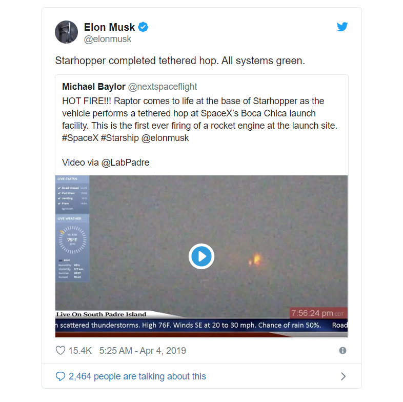 SpaceX -ის ახალი თაობის კოსმოსურმა რაკეტა Starship-მა წარმატებით გაიარა საბორტო ძრავის გამოცდა, თუმცა ტრანსპორტი შორს არ წასულა. ძრავის ამოქმედება იყო გამოცდა, ე.წ. static fire, რომელიც განკუთვნილი იყო ძრავის გამოსაცდელად. ხსენებული გამოცდა პირველ შემთხვევას წარმოადგენს, როდესაც რაკეტა ამოქმედდა საკუთარი ძრავის მეშვეობით და შეძლებს ფრენას უახლოეს მომავალში. საუბარი ეხება კონკრეტულ სატრანპორტო საშუალება „Starhopper»-ს, რომელიც განკუთვნილია Starship-ის საბაზისო კონსტრუქციისა და ტექნოლოგიის ტესტირებისთვის. როგორც უკვე ვიცით, Starship – ეს არის გიგანტური კოსმოსური რაკეტა, რომელმაც უნდა უზრუნველყოს ადამიანების მთვარესა და მარსზე ტრანსპორტირება. ილონ მასკის თქმით, Starship/Super Heavy combo შეძლებს დედამიწის ახლო ორბიტაზე გაიტანოს 100 ათასი კგ ტვირთი, რაც მას აქცევს ერთ-ერთ უმძლავრეს რაკეტად, რაც კი ოდესმე შექმნილა. მანამდე, სანამ რაკეტა კოსმოსში გავა, SpaceX გეგმავს რამოდენიმე სატესტო ფრენის განხორციელებას Starhopper-ით. ეს გამოცდები მოიცავს ძრავის (ან ძრავების) შემოწმებას. გამოიცდება ახალი მძლავრი ძრავი Raptor – რაკეტის უმნიშვნელოვანესი ელემენტი სამომავლო Starship-ისა და სუპერმძიმე რაკეტისთვის. SpaceX-მა Raptor-ის სრული ვერსია თებერვალში წარმოადგინა. დღესდღეობით Starhopper-ში მხოლოდ ერთი Raptor-ძრავია განთავსებული, რაც ილონ მასკის თქმით, რაკეტას საკმაოდ მაღლა ვერ ასწევს. ზემოთხსენებული გამოცდის მსვლელობისას მოწყობილობამ მიწის ზედაპირიდან რამდენიმე დუიმზე შეძლო აწევა. საბოლოო ჯამში დაგეგმილია დამონტაჟდეს სამი ძრავი, რათა რაკეტამ შეძლოს საჭირო სიმაღლეზე ასვლა. ამგვარი ფრენები სატრანსპორტო საშუალებას ატმოსფეროს ქვედა ფენაში გაიყვანს. მსგავსი გამოცდები უკვე ჩატარდა რაკეტა Falcon 9 Grasshopper-ის მეშვეობით 2012-2013 წლებში. ჯერჯერობით უცნობია, რამდენ სატესტო ფრენას განახორციელებს SpaceX. მასკი ამტკიცებდა, რომ Starship-ის პირველი ორბიტალური ფრენა 2020 წლის დასაწყისში განხორციელდება, თუმცა მისი ოპტიმისტური პროგნოზების ამბავი ყველასთვის კარგადაა ცნობილი. https://www.theverge.com/2019/4/3/18271547/spacex-starship-starhopper-raptor-engine-ignition-hop-static-fire-test