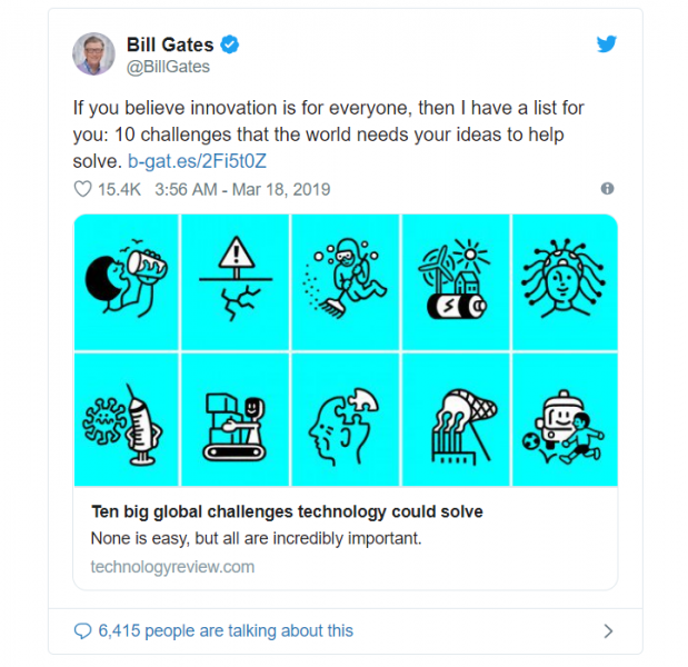 კორპორაცია Microsoft-ის დამფუძნებელმა და ერთ-ერთმა უმდიდრესმა ადამიანმა საზოგადოებას მოუწოდა იპოვონ ათი მთავარი გლობალური პრობლემის მოგვარების საშუალება. კოსმოსის შესწავლის ნაცვლად იგი მოუწოდებს კაცობრიობას - გაუმჯობესდეს ცხოვრება ჩვენს პლანეტაზე. ბილ გეითსი - ყოფილი პროგრამისტი და ერთ-ერთი ყველაზე წარმატებული IT-კომპანიის დამფუძნებელი - ცნობილია არა მხოლოდ თავისი უზარმაზარი ქონებით, არამედ იმითაც - რაში ხარჯავს მას. სანამ პლანეტის უმდიდრესი ადამიანი - ჯეფ ბეზოსი კონკურენციის გაწევას ცდილობს მილიარდერ გამომგონებელ ილონ მასკთან იმაზე - პირველი რომელი მათგანი მოახდენს მარსისა და მთვარის კოლონიზებას, აგრეთვე ააგებს ბიზნეს-იმპერიას თანამგზავრული ინტერნეტის კუთხით, გეითსი ცდილობს აქცენტი გააკეთოს კაცობრიობისთვის ამჟამად არსებულ პრობლემებზე. თანაც, მან ამ მიმართულებით იმაზე არანაკლები თანხა დახარჯა, რა რაოდენობის ინვესტიციაც ჩაიდო SpaceX-ისა და Blue Origin-ის რაკეტებში. Microsoft-ის ხელმძღვანელის თანამდებობის დატოვებამდე რამოდენიმე წლით ადრე გეითსმა დააარსა საქველმოქმედო ფონდი, რომელსაც სახელი თავისი და თავისი მეუღლის, მელინდას პატივსაცემად უწოდა. BBC-ის ინფორმაციით, 2016 წლამდე გეითსმა ქველმოქმედებაზე დაახლოებით 31 მლრდ დოლარი დახარჯა. ბილ და მელინდა გეითსების ფონდმა ინვესტიციები ჩადო ჯანდაცვის სისტემების გაუმჯობესებაში, ღარიბ ქვეყნებში სიღარიბესთან ბრძოლაში, მთელ მსოფლიოში რთული დაავადებების მკურნალობაში და ა.შ. ამის გამო ჟურნალმა Forbes-მა რამოდენიმე წლის წინ ბილ გეითსი აშშ-ის ყველაზე გულუხვ მილიარდერად დაასახელა. რამოდენიმე დღის წინ ფილანთროპმა თავის Twitter-ზე გამოაქვეყნა ათი გლობალური პრობლემის ჩამონათვალი, რომელთა მოგვარებაც უმნიშვნელოვანესია ჩვენი პლანეტისთვის და ახლო მომავალშიც ასე იქნება. „თუკი გჯერათ, რომ ინოვაციები ყველასთვისაა, მაშინ მე მაქვს ჩამონათვალი თქვენთვის: 10 პრობლემა, რომელიც უნდა გადაიჭრას თქვენი იდეების წყალობით“ - დაწერა გეითსმა. გეითსი ცდილობს ადამიანთა ყურადღება მიაპყროს შემდეგ პრობლემებზე: სათბურის ეფექტისა და ატმოსფეროში ნახშირორჟანგის რაოდენობის შემცირება; ელექტროენერგიის დაზოგვა, რომელიც მიიღება განახლებადი წყაროებიდან; უნივერსალური ვაქცინა გრიპის ყველანაირი ფორმისათვის; დემენციის სხვადასხვა ფორმის, მათ შორის ალცჰაიმერის დაავადების მკურნალობა; მსოფლიო ოკეანის გაწმენდა პლასტმასის ნარჩენებისგან; წყლის ენერგოეფექტური გამტკნარება; უსაფრთხო ავტომობილების წარმოება; ხელოვნური ინტელექტის თანამ