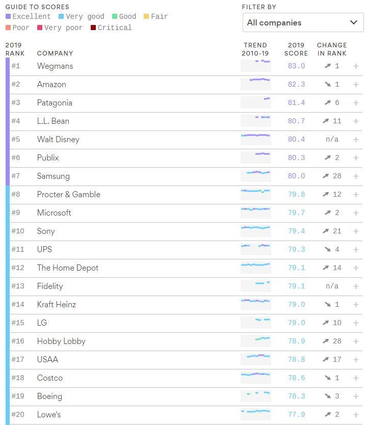 ახალი კვლევის შედეგად ცნობილია, რომ ტექნოლოგიურ კომპანიებს შორის ამ დროისათვის საუკეთესო რეპუტაციით Amazon-ი სარგებლობს. მასთან ახლოსვე ზედა პოზიციებზე იმყოფებიან Samsung-ი და Microsoft-ი. კვლევა განხორციელდა ორ ეტაპად. თავდაპირველად მოხდა 6 ათასი სრულწლოვანი ამერიკელი მოქალაქის გამოკითხვა, მათ სთხოვეს დაესახელებინათ ყველაზე კარგი და ყველაზე ცუდი რეპუტაციის მქონე ორი კომპანია. შემდეგ კი 18 ათასმა მონაწილემ შეადგინა 100 ცნობილი კომპანიისგან შემდგარი სია. კომპანიები სხვადასხვა საწარმოო სფეროების წარმომადგენლები არიან. საბოლოო რეიტინგს სათავეში უდგას კომპანია Wegmans-ი, რომლის სახელწოდებაც ბევრს ვერაფერს ეტყვის საშუალოსტატისტიკურ მკითხველს. მას მოჰყვება Amazon-ი და Patagonia. Amazon-მა ერთი ადგილით უკან დაიხია 2017 წლის შემდეგ, თუმცა წინ უსწრებს სხვა ტექნოლოგიურ კომპანიებს. Samsung-ი მეშვიდე ადგილზე იმყოფება 80 ქულით, Amazon-ს კი 82,3 ქულა აქვს. 2019 წლის რეიტინგის ლიდერს, ზემოთხსენებულ Wegmans-ს 83 ქულა ერგო. კომპანია Microsoft-ი ჩამონათვალში რიგით მეცხრეა 79,9 ქულით, რაც ორი ქულით მეტია მის წინა წლის მაჩვენებელთან შედარებით. Apple 32-ე ადგილზე იმყოფება 76,4 ქულით, Google კი 41-ე ადგილს იკავებს 75,4 ქულით. თუკი გავითვალისწინებთ მხოლოდ ტექნოკომპანიების რეიტინგს, მათ სათავეშია Samsung-ი, Microsoft-ი და Sony. კვლევის ავტორებმა Amazon-ი მოათავსეს კატეგორიაში - „სხვა“. Microsoft-მა საუკეთესო შეფასებები მიიღო პროდუქტებსა და სერვისებზე, ხედვებზე, ზრდასა და კულტურაზე. სოციალურ პასუხისმგებლობაზე კი მინიმალური შედეგი დააფიქსირა. Apple-თან შედარებით Microsoft-ის შედეგები ჯამში უკეთესია. შემცირებული დადებითი შედეგები დაფიქსირდა Facebook-ზე, რაც განპირობებული იყო კონფიდენციალურობის დარღვევის შემთხვევებით. კომპანიამ დაკარგა 43-ე ადგილი და იმყოფება 94-ე ადგილზე. https://overclockers.ru/blog/Scorpion81/show/24739/reputacija-microsoft-luchshe-chem-u-apple-i-google