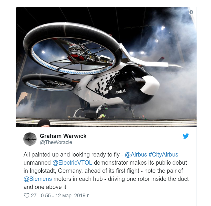 კომპანია Airbus-მა გერმანიის ქალაქ ინგოლშტადტში მოაწყო თავისი პირველი მფრინავი ტაქსის - CityAirbus-ის პრეზენტაცია. მფრინავ აპარატ CityAirbus-ს შეუძლია გადაადგილდეს 120 კმ/სთ სიჩქარით 30 კილომეტრის მანძილზე. ეს ტაქსი მსოფლიოს უმსხვილეს ქალაქებში 2025 წელს გამოჩნდება. მფრინავი ტაქსის წონა 2,2 ტონას აღემატება. მის შიგნით არის ორი ადგილი მგზავრებისთვის და ერთი - მძღოლისთვის, თუმცა ამ ტაქსიში ინტეგრირებული იქნება უპილოტო გადაადგილების ფუნქციაც. CityAirbus-ის ღირებულება 1 მლნ ევროს შეადგენს. ვერტიკალური აფრენისა და დაშვების სისტემის წყალობით CityAirbus-ს არ სჭირდება დიდ ფართობის საფრენი მოედნის გამოყენება. უახლოეს პერიოდში გერმანიის ხელისუფლება დაიწყებს კანონმდებლობაზე მუშაობას, რომლის მიხედვითაც ნებადართული იქნება ქალაქის პირობებში საფრენი აპარატების ტაქსებად ან პირად ტრანსპორტად გამოყენება. მიუხედავად პრეზენტაციისა, Airbus-ს ამ დრომდე არასდროს განუხორციელებია CityAirbus-ის ფრენის სახალხოდ გამოცდა. გარდა ამისა, მცირე ხნის წინ Airbus-მა, Audi-მ და Italdesign-მა წარადგინეს მომავლის საფრენი კაფსულა-ტაქსის - Pop.Up-ის მოდელი. მფრინავი ტაქსებისადმი ამჟამად მთელ მსოფლიოში შეინიშნება გაზრდილი ინტერესი. ჰოლანდიური კომპანია PAL-V უკვე წინასწარ შეკვეთებს იღებს მსოფლიოში პირველ სერტიფიცირებულ მფრინავ ავტომობილზე. დრონების ჩინური მწარმოებელი Ehang-ი კი თავის ერთადგილიან უპილოტო აპარატებს მიაწვდის დუბაის ხელისუფლებას - მათი მოქმედებაში მასიურად დანერგვა მიმდინარე წლის ზაფხულიდან დაიწყება. აგრეთვე თავისი პირველი სამგზავრო დრონის ტესტირება უკვე განახორციელა კომპანია Passenger Drone-მა. https://hightech.fm/2019/03/12/airbus-cityairbus