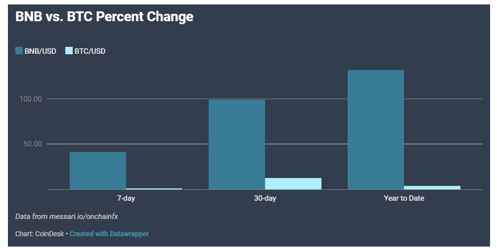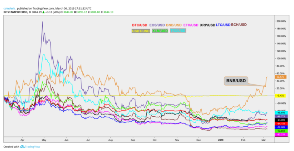 Binance Coin (BNB), კრიპტო აქტივი, რომლის საკომისიოზე გაცვლაც შესაძლებელია Binance Exchange-ზე, ბოლო წლებში თითქმის 140 %-ით გაიზარდა და ამჟამად აღარ მიჰყვება Bitcoin-ის ფასის ტენდენციებს - ეს არის წარმატება, რომელიც არ შეინიშნება განვითარებად კრიპტო ბაზარზე. მიუხედავად იმისა, რომ მიზეზები, რის გამოც უმეტესი კრიპტოვალუტა მჭიდროდაა კავშირში Bitcoin-თან, არ არის უპირობო - კვლევებმა აჩვენა, რომ Bitcoin-ის ტენდენციებზე დამოკიდებულება დროთა განმავლობაში მხოლოდ ძლიერდება. BNB კი საპირისპიროს ამტკიცებს. BNB ამ დროისთვის მერვე ადგილს იკავებს CoinMarketCap-ის მონაცემების მიხედვით. იგი ფაქტობრივად ერთადერთი კრიპტოვალუტაა ტოპ-10-დან, რომელიც დოლართან მიმართებაში იღებს წლიურ შემოსავალს. მისი მომდევნო, Tron-ის TRX ტოკენი ყოველწლიურ 44%-იან დანაკარგს განიცდის. ტოპ 10 კრიპტოვალუტა (წლიური პროცენტული ცვლილება) როგორც მოყვანილ გრაფიკზე ჩანს, ბაზრის კაპიტალიზაციის მიხედვით 10 საუკეთესო კრიპტოვალუტა, როგორც წესი, მჭიდროდაა ერთმანეთთან დაკავშირებული. გამონაკლისია Tether stablecoin (USDT) იმის გათვალისწინებით, რომ იგი ინარჩუნებს მუდმივ ღირებულებას. ამ კავშირმა BNB/USD-სთვის დასუსტება დაიწყო 2019 წლის დასაწყისში და ამას მოწმობს მისი მოქმედების ამსახველი ხაზი (ზემოთ ნარინჯისფერი), რომელიც მნიშვნელოვნადაა გადახრილი სხვა ცნობილი კრიპტოვალუტებისგან, რის გამოც იგი ყველაზე მეტად bulish არის კრიპტოების ჯგუფთან შედარებით. BNB / USD მაჩვენებლები BTC / USD-ს წინააღმდეგ ცხადია, რომ BNB-მ როგორც ჩანს საკუთარი კურსი აიღო, იგი აგრძელებს ტენდენციას - მნიშვნელოვნად აღემატებოდეს Bitcoin-ს. BNB/USD-ს პერფორმანსი წინა წელთან შედარებით მნიშვნელოვნად აღემატება Bitcoin-ს. იგი 141,7%-ით გაიზარდა იმ დროს, როდესაც BTC-ის ზრდის მაჩვენებელი მხოლოდ 4 პროცენტია. BNB აგრეთვე ახდენს საუკეთესო შედეგების დემონსტრირებას უფრო მოკლევადიან პერსპექტივებში, მათ შორის უკანასკნელ 7 და 30-დღიან პერიოდებში: კრიპტოვალუტამ დააფიქსირა 41,47% და 99,17%-იანი ზრდის მაჩვენებელი, შესაბამისად. ამავე პერიოდში BTC-ის მაჩვენებლებია 1,62 და 12,65 %. უნდა აღინიშნოს, რომ მცირე ხნის წინ დაფიქსირებულმა Bitcoin-ის აღდგენითმა ტემპმა დააინტერესა ინვესტორები კრიპტო ბაზრით, რამაც მოთხოვნა გაზარდა BNB-ზე. კრიპტო ბაზრის კორელირების მაღალი დონისა და ბაზრის მოუმწიფებლობის გამო ნაკლებად სარწმუნოა, რომ BNB მონიშნავს საკუთარ განსხვავებულ ტენდენციას ხანგრძლივ პერიოდში, თუმცა მხოლოდ დრო გვიჩვენებს, როდის გახდება BNB განცალკევებული. https://www.coindesk.com/binances-crypto-bnb-no-longer-tracks-bitcoin-and-thats-a-big-deal