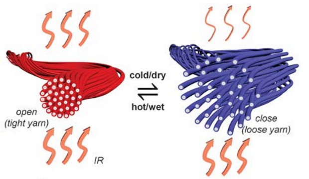 ტანსაცმლის ზოგიერთი მწარმოებელი თავიანთ პროდუქტს უმატებს სენსორებს, რომლებიც თვალყურს ადევნებს მფლობელის ჯანმრთელობის მდგომარეობას. ამგვარი ფუნქცია, რა საკვირველია, საინტერესოა, თუმცა მომხმარებელთა უმეტესობას სრულიად ბანალური მოთხოვნა აქვს - მათთვის მნიშვნელოვანია, რომ ტანსაცმელი თბებოდეს სიცივეში და აგრილებდეს სიცხეში. მერილენდის უნივერსიტეტის მკვლევარებმა შეიმუშავეს ტემპერატურისადმი ადაპტირებადი მასალა, რომლისგან სხვადასხვა სახის მაისურების დამზადებაა შესაძლებელი. სპორტული ტანსაცმლის მწარმოებლები უკვე იყენებენ მაღალი გამტარუნარიანობის მქონე მასალებს, თუმცა მათი ეს თვისება მოქმედია მუდმივად და არა იმ დროს, როდესაც საჭიროა. იმისათვის, რომ ფიზიკური აქტივობის დროს რეაგირება მოეხდინა სხეულის ტემპერატურის ცვლილებებზე, მკვლევარებმა შექმნეს ქსოვილი ძაფისგან, რომელიც შედგება ორგვარი ბოჭკოსგან - ეს ბოჭკოები იწოვენ და უკუაგდებენ სინოტივეს. სხეულის დატენიანებისას ქსოვილი თხელი ხდება და მასზე ფორები ჩნდება. ქსოვილში აგრეთვე არის ნახშირბადის ნანომილაკები, რომლებიც ქსოვილის თვისებებს მოქმედებაში ხელს უწყობს. ამგვარი მაისურის გამოყენებისას ორგანიზმი ორგვარად გრილდება: პირველი - მაისურის ფორებიდან და მეორე - ნანომილაკები ეხმარებიან სხეულს მეტი სითბოს გამოყოფაში. როდესაც ადამიანი პასიურ მდგომარეობაში იმყოფება, მატერიალი ინარჩუნებს ოპტიმალურ ტემპერატურას და მომხმარებელი არ განიცდის ზედმეტი სიცივის შეგრძნებას. ქსოვილის ეფექტურობის შესამოწმებლად მკვლევარებმა იგი მოათავსეს რეგულირებადი სინოტივის კონტეინერში. მისი გამტარუნარიანობის გაზომვის შედეგად მკვლევარებმა გაარკვიეს, რომ სინესტის 90%-მდე მომატებისას გამტარუნარიანობა 35,4%-მდე გაიზარდა. „მომავლის ტანსაცმლისთვის“ მასალების შექმნით უამრავი კომპანია და კვლევითი ჯგუფია დაკავებული. 2018 წლის ბოლოს კომპანია Fast Company-მ გამოუშვა გრაფენით დამზადებული ქურთუკი, რომელიც ასევე შესანიშნავად ინარჩუნებს ან გამოყოფს სითბოს გარემომცველი პირობების შესაბამისად. https://hi-news.ru/technology/futbolka-iz-etoj-tkani-spaset-vas-v-lyubuyu-zharu.html