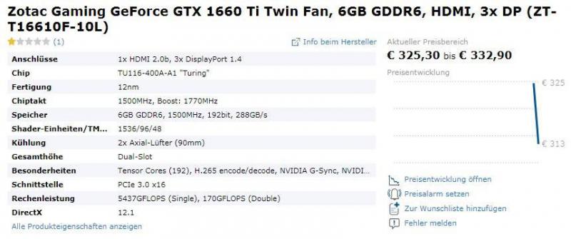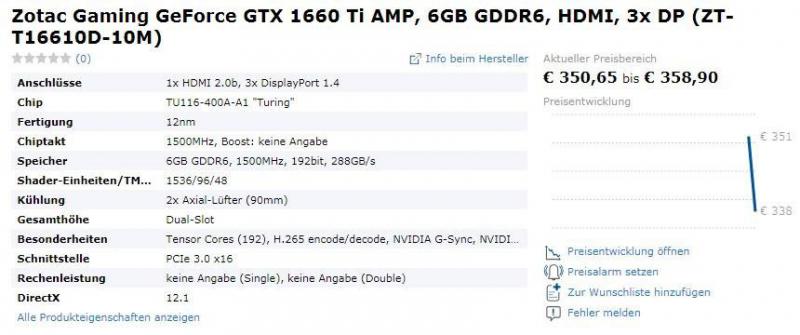 Videocardz-მა გამოაქვეყნა EVGA-სა და Palit-ის მიერ შექმნილი GeForce GTX 1660 Ti გრაფიკული ამაჩქარებლების ფოტოები. როგორც ცნობილია, კომპანია EVGA გაყიდვების საწყის ეტაპზე წარადგენს მხოლოდ კომპაქტურ მოდელებს - GTX 1660 Ti XC-სა და GTX 1660 Ti Black-ს. ორივე ბარათი აწყობილია შემცირებულ PCB დაფაზე EVGA-ს საკუთარი დიზაინით და აქვთ ერთვენტილატორიანი გაგრილების სისტემა. გარეგნულად ვიდეო ბარათები იდენტურად გამოიყურება, ისინი ერთმანეთისგან მხოლოდ GPU-ის ტაქტის სიხშირეებით განსხვავდება. კომპანია Palit-მაც StormX-სერიის ორი ვიდეო ბარათი გამოუშვა, რომლებიც კიდევ უფრო კომპაქტური გაბარიტებით ხასიათდება, ვიდრე EVGA-ს მოდელები. ამ ბარათებშიც გამოყენებულია ერთვენტილატორიანი გაგრილების სისტემა რადიატორითა და სითბური მილებით. GeForce GTX 1660 Ti StormX-ის გრაფიკული პროცესორის boost-სიხშირე 1770 მჰც-ია, GeForce GTX 1660 Ti StormX OC ბარათისა კი - 1815 მჰც. რა თქმა უნდა, ორივე მწარმოებელი GeForce GTX 1660 Ti ბარათის სხვა ვერსიებსაც გამოუშვებენ მოგვიანებით. Videocardz-ის ინფორმაციით GeForce GTX 1660 Ti-ს გაყიდვები 22 თებერვლიდანაა დაგეგმილი. წყარო: VideoCardz მომხმარებლებს ორი ახალ ბარათს სთავაზობს ZOTAC-იც: ZOTAC Gaming GeForce GTX 1660 Ti Twin Fan და Gaming GeForce GTX 1660 Ti AMP. ორივე ბარათის საფუძველს წარმოადგენს Turing-ის თაობის 12-ნანომეტრიანი პროცესორი TU116-400A-A1, რომლის საბაზისო სიხშირე 1500 მჰც-ია, ასევე აქვს 1536 Shader-ბლოკი, 192 ტენსორული ბირთვი, 96 ტექსტურული მოდული (TMU) და 48 ROP-ბლოკი. წყარო: Geizhals Österreich ორივე მოდელს აქვს 6 გბ GDDR6 ტიპის ოპერატიული მეხსიერება, რომელიც 1500 მეგაჰერც სიხშირეზე ფუნქციონირებს, აგრეთვე 192-ბიტიანი bus, სიჩქარე - 288 გბ/წმ. ბარათს აქვს HDMI 2.0b პორტი დაა სამი DisplayPort 1.4. ZOTAC Gaming GeForce GTX 1660 Ti Twin Fan ვიდეო ბარათის ფასი 325-დან 333 ევრომდეა, Gaming GeForce GTX 1660 Ti AMP ბარათისა კი - დაახლოებით 351-359 ევრო. ახალი ბარათის ოფიციალურ ანონსამდე ცოტა დროა დარჩენილი. https://3dnews.ru/982579 https://overclockers.ru/blog/id_1/show/24184/dve-modeli-geforce-gtx-1660-ti-ot-zotac-zasvetilis-v-neskolkih-magazinah