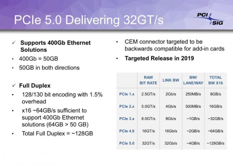 ორგანიზაცია PCI Special Interest Group-მა (PCI SIG), რომლის მოვალეობაშიც შედის მონაცემთა გადაცემის სტანდარტების შემუშავება და განვითარება PCI-ის ბაზაზე, განაცხადა PCI Express 5.0-ის სპეციფიკაციის 0.9 ვერსიის ხელმისაწვდომობის შესახებ, რაც ნიშნავს იმას, რომ მუშაობა ახალ სტანდარტზე შედის ფინალურ ფაზაში. ბოლო რამდენიმე წელია პერსონალური კომპიუტერების ინდუსტრიის განვითარება გაჩერდა „ძველ“ PCI Express 3.0-ის სტანდარტზე მონაცემთა გადაცემის 8გბ/წ სიჩქარით, მაგრამ PCI Express 4.0 სტანდარტის სწრაფი გამოჩენა AMD-ს პროდუქტებში გააორმაგებს ამ მონაცემებს 16 გბ/წ-მდე. სავარაუდოდ, PCI Express 4.0-ს მალევე ჩაანაცვლებს ახალი PCI Express 5.0, რომელზეც უკვე მიდის მუშაობა, თუმცა არაა გამორიცხული, რომ ორივე სტანდარტი პარალელურ რეჟიმში დაინერგოს. PCI Express 5.0 სტანდარტის მონაცემთა გადაცემის სიჩქარე გაუტოლდება 32 გბ/წ-ს, ამასთან ის გამოიყენებს 128b/130b კოდირებას, რაც საშუალებას მისცემს მთლიანი სიჩქარე გაიზარდოს 128 გბ/წ-მდე. ახალი სტანდარტი ითვალისწინებს სიგნალის გაუმჯობესებას და შეყოვნების შემცირებას, ასევე PCI-ის ძველ ვერსიასთან ადაპტაციას. სავარაუდოა, რომ PCI Express 5.0 გამოყენებას ჰპოვებს მაღალი წარმადობის სისტემებში, რომლებიც დაკავშირებულია ხელოვნურ ინტელექტთან, მანქანურ სწავლებასთან, მონაცემთა დამუშავებასა და მოდელირებასთან. საბოლოო ვერსია 1.0 უნდა გამოვიდეს 2019 წლის პირველ კვარტალში. https://overclockers.ru/blog/id_1/show/23551/rabota-nad-standartom-pci-express-50-blizka-k-svoemu-zaversheniju