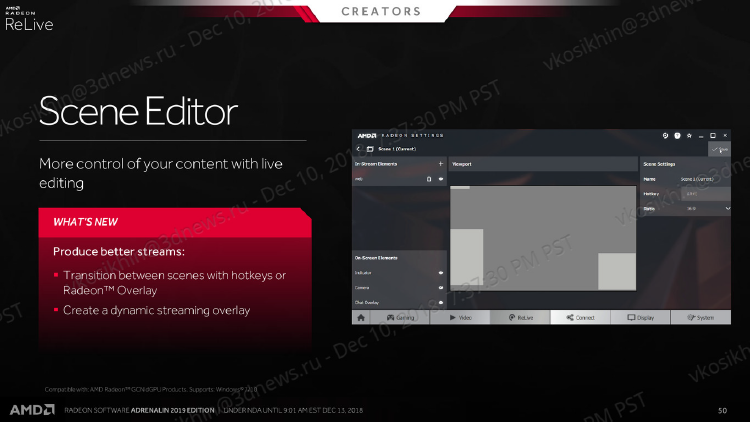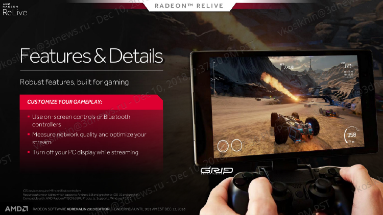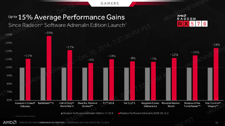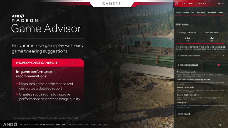 Radeon Technologies Group-ის ინჟინრებმა ბოლო თვეები დაუთმეს „წითელი ბრენდის“ გრაფიკული ამაჩქარებლებისთვის განახლებული პროგრამული ნაკრების შემუშავებას. დრაივერის პირველი ვერსიის - Adrenalin Edition-ის შემდეგ, რომელიც 2017 წლის დეკემბერში გამოვიდა, კომპანიამ შეძლო მნიშვნელოვნად გაეზარდა წარმადობა თავის მოწყობილობებში პროგრამული უზრუნველყოფის ხარჯზე. დრაივერების ახალი პაკეტი, სახელწოდებით Radeon Software Adrenalin 2019 Edition-ი არ იქნება წარმოდგენილი რაიმე განსაკუთრებული სიჩქარით წინა ვერსიასთან შედარებით, თუმცა განახლება მოიტანს გარკვეულ ცვლილებებს: ოფიციალური მონაცემების მიხედვით, Radeon RX Vega 64-ის კადრების ცვლის საშუალო სიხიშრე პოპულარულ თამაშებში ერთ წელიწადში 7%-ით გაიზარდა, Radeon RX 580-ის შემთხვევაში კი - 15%-ით. Radeon Software Adrenalin 2019 Edition კონცენტრირებულია სამომხმარებლო ინტერფეისზე, გრაფიკული პროცესორის აპარატულ პარამეტრებზე და ასევე მობილურ მოწყობილობებში ინტეგრაციაზე. იმისათვის, რომ გაერკვია, რომელი ფუნქციები იყო უმნიშვნელოვანესი, AMD-მ გამოკითხვა და ხმისმიცემა ჩაატარა მომხმარებლებს შორის. პირდაპირ თამაშის პროცესში შესაძლებელია ბენჩმარკის გაშვება, რომელიც მომხმარებელს აჩვენებს კადრების ცვლის სიხშირესა და ლატენურობის მონაცემებს, შემდეგ კი დრაივერი შესთავაზებს შეცვალოს ესა თუ ის პარამეტრი. ენერგომოხმარების პროფილებთან დაკავშირებით, რომლებიც ამ დრომდე ხელმისაწვდომი იყო Polaris და Vega ჩიპებზე არსებული ვიდეო ბარათებისთვის, Radeon Software Adrenalin 2019 Edition წარმოდგვიდგენს აპარატული პარამეტრების ავტომატურ სამ ფუნქციას: გრაფიკური პროცესორის აჩქარება, ოპერატიული მეხსიერების აჩქარება და “undervolting” (GPU-ს ძაბვის შემცირება). AMD-მ გაზარდა Radeon Chill-ალგორითმის ეფექტურობა, რომელიც ამცირებს GPU-ს სიხშირეს დატვირთვის დროს. კომპანიამ მთლიანად გადაამუშავა პროგრამა, რათა გაადვილდეს PC-თან მიერთება და კავშირი იყოს უფრო სტაბილური. რადგა ამისა, AMD Link-ის საშუალებით შესაძლებელი იქნება თამაშების გაშვება მობილურ მოწყობილობებზე როგორც ვირტუალური გეიმპადით, აგრეთვე მართვის აპარატული ორგანოებით. და ბოლოს, Radeon-ვიდეო ბარათებისთვის განკუთვნილი პროგრამური უზრუნველყოფა ოფიციალურად იღებს უსადენო VR ჰედსეტების მხარდაჭერას. Radeon Software Adrenalin 2019 Edition-ის შემადგენლობაში ასევე შედის განახლებული ReLive - თამაშების ტრანსლირებისთვის. პროგრამის ინტერფეისში შესაძლებელია სტრიმინგ-ფანჯრის შექმნა, აგრეთვე დაემატა თამაშის ბოლო 5-30 წამის გამეორების ფუნქცია. ამგვარი გახლავთ Radeon-ვიდეო ბარათებისთვის განკუთვნილი სამომავლო სოფთვეარის ძირითადი ფუნქციები, მახასიათებ