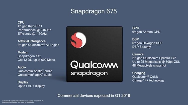 კომპანია Qualcomm-მა დააანონსა ახალი პროცესორი - Snapdragon 675, რომელიც ძირითადად განკუთვნილია საშუალო დონის სმარტფონებისთვის. როგორც მწარმოებელი აცხადებს, ხელოვნური ინტელექტის საფუძველზე ამ პროცესორის წყალობით სმარტფონებს ექნებათ გაუმჯობესებული ფუნქციები და გეიმინგ შესაძლებლობები. პროცესორისთვის განსაზღვრულია 11 ნანომეტრიანი ტექნოლოგია. ჩიპს აქვს რვა Qualcomm Kryo 460 ბირთვი ტაქტის სიხშირით 2,0 გჰც-მდე. გრაფიკული ქვესისტემის შემადგენლობაში შედის გრაფიკული ბირთვი Qualcomm Adreno 612. კონფიგურაცია მოიცავს ციფრულ პროცესორს Qualcomm Hexagon 685 DSP და გამოსახულების დამუშავების პროცესორს - Qualcomm Spectra 250L-ს. დისპლეის რაც შეეხება, ხსენებულ პროცესორთან მიმართებაში საუბარია 2520 × 1080 გაფართოების მქონე დისპლეიზე, ასევე 25 მეგაპიქსელიან კამერაზე ან ორ კამერაზე 16-16 მეგაპიქსელიანი სენსორებით. ხელოვნურ ინტელექტთან დაკავშირებული ოპერაციების აჩქარებაზე პასუხისმგებელია Qualcomm AI Engine ძრავი. ინტეგრირებული მოდემი - Qualcomm Snapdragon X12 LTE - უზრუნველყოფს მონაცემთა ჩამოტვირთვას 600 მბიტ/წმ. სიჩქარით, ინფორმაციის გადაცემის სიჩქარე კი იქნება დაახლოებით 150 მბიტი/წმ. გათვალისწინებულია უსადენო კავშირების Wi-Fi 802.11ac Wave 2 და Bluetooth 5.0 მხარდაჭერა. აგრეთვე, GPS/GLONASS/Beidou/Galileo, NFC ტექნოლოგია და სწრაფი დატენვის სისტემა - Qualcomm Quick Charge 4+. Snapdragon 675 პლატფორმაზე აგებული მოწყობილობები გამოჩნდება მომავალი წლის პირველი კვარტლიდან. https://3dnews.ru/977159