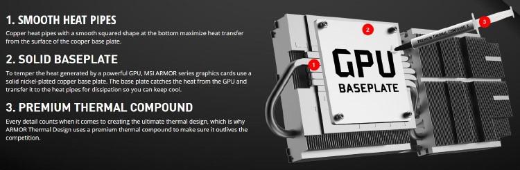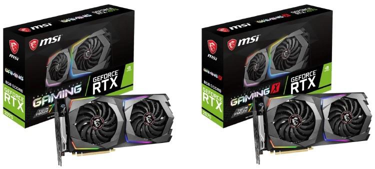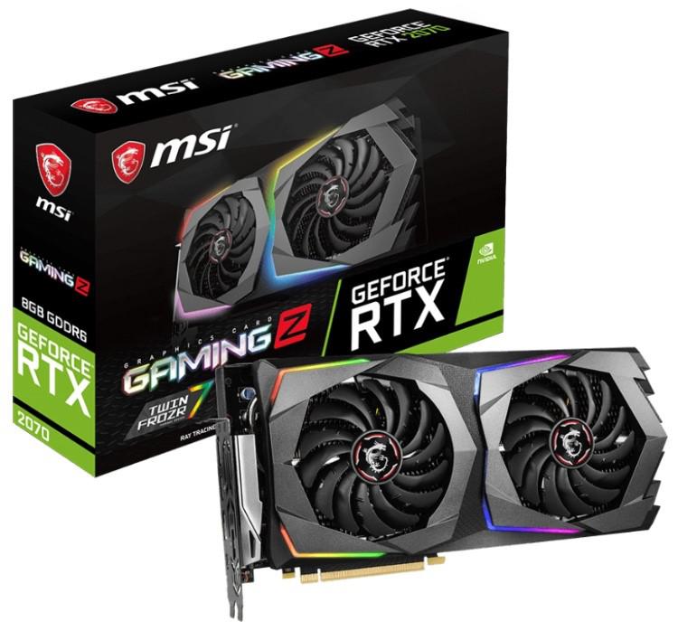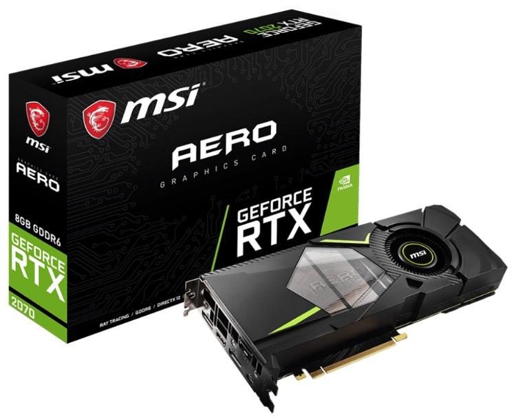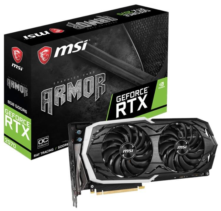 GeForce RTX 2070 ვიდეობარათების ოფიციალური ანონსის ფარგლებში კომპანია MSI-მ წარადგინა ცხრა ვიდეო ბარათი, რომლებიც დაყოფილია ოთხ ჯგუფად: Gaming კატეგორია (ყველაზე ძლიერი) Armor (gaming-ის გამარტივებული ვერსია) Duke (მოდელები მასიური, სამვენტილატორიანი ქულერით) Aero (ტურბინიანი ადაპტერით) GeForce RTX 2070 Gaming ამ სერიაში გამოვიდა სამი ვიდეო ბარათი: GeForce RTX 2070 Gaming Z 8G; GeForce RTX 2070 Gaming X 8G; GeForce RTX 2070 Gaming 8G. ფლაგმანური მოდელი აღნიშნულია სუფიქსით “Z” და ხასიათდება გრაფიკული ბირთვის მაქსიმალური სიხშირით: 1410–1830 მჰც (რეკომენდებული დიაპაზონია 1410–1620 მჰც). GDDR6 მეხსიერების მოცულობაა 8 გბ (არ ექვემდებარება ოვერქლოქინგს: 1750 მჰც სიხშირეზე ოპერატიული მეხსიერების სიჩქარეა 14 გბიტ/წმ.). ეს ვიდეო ბარათი გამოირჩევა არა მარტო გარეგნული მახასიათებლებით (კერძოდ, Mystic Light-ის RGB განათებით), არამედ PCB დაფის განსაკუთრებული დიზაინითა და გაგრილების სისტემით. ეს უკანასკნელი იყენებს სამი სლოტის სივრცეს და შედგება ორი Torx 3.0 ვენტილატორისგან. აქვს ალუმინის რადიატორი, რადიატორის სპილენძის ფუძე და ექვსი მონიკელებული სპილენძის სითბური მილი. მილთაგან ერთ-ერთს სხვებზე დიდი - 10 მილიმეტრიანი დიამეტრი აქვს. GeForce RTX 2070 Gaming მოდელების გაგრილება ხდება СО Twin Frozr 7-ის საშუალებით სითბოს ნაწილის გაფანტვას ახდენს წინა და უკანა ფირფიტები. VRM ტრანზისტორების უმეტესობა კონტაქტშია მთავარი გამაგრილებლის ფირფიტებთან, რამოდენიმე კი ეხება რადიატორის ფრონტალურ ფირფიტას. MSI GeForce RTX 2070 Gaming Z 8G-ის კვების სისტემა ათფაზიანია. აქვს კონექტორების კონფიგურაციების არასტანდარტული კვების სისტემა: 8-პინიან PCI-E Power-ს დამატებული აქვს 6-პინიანი. აღსანიშნავია, რომ GeForce RTX 2070 კლასის ვიდეო ბარათებს არ აქვს NVLink SLI მხარდაჭერა - MSI-მ გამოიყენა კონსერვატიული მიდგომა: ვიდეობარათს აქვს ერთი HDMI 2.0b კონექტორი, ერთიც USB 3.1 Type-C პორტი და სამი DisplayPort 1.4. GeForce RTX 2070 Gaming X 8G და GeForce RTX 2070 Gaming 8G ეს ორი, “X” სუფიქსიანი ვიდეო ბარათი მუშაობს 1410–1710/1750(14 000) მჰც სიხშირეზე და საჭიროებს 225 ვატს დატვირთვის დროს, ისევე როგორც Gaming Z. მისგან განსხვავდებიან იმით, რომ აქვთ გრაფიკული ბირთვი TU106-400 - ნაცვლად TU106-400A-სა. MSI GeForce RTX 2070 Gaming 8G ვიდეო ბარათის ენერგომოხმარება 175 ვატის ტოლია, კვების კონექტორების კონფიგურაცია ამ შემთხვევაშიც გვაქვს 6+8-პინიანი. ვიდეო ბარათის გაბარიტებია 307 × 155 × 50 მმ, წონა: 1,5 კგ. GeForce RTX 2070 Armor MSI GeForce RTX 2070 ვიდეო ბარათების „ჯავშნიან“ სერიაში წარმოდგენილია სამი ბარათი: Armor 8G OC, Armor 8G OCV1 და Armor 8G. მიუხედავად Gaming სერიის ბარათებთან ვიზუალური მსგავსებისა, Armor ვიდეო ბარათები უფრო მოკრძალებულ „არსენალს“ ფლობენ. რთული კონსტრუქციის მქონე Torx 3.0 ვენტილატორების ნაცვლად, გამოყენებულია წინა თაობის Torx 2.