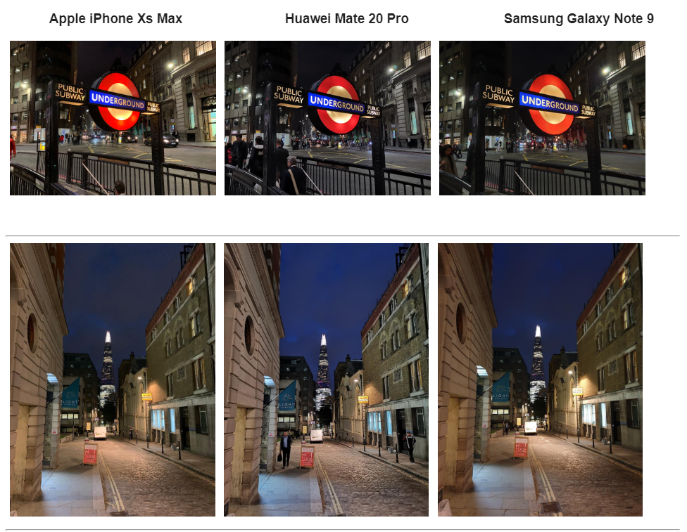 დღესდღეობით, სმარტფონებში არსებული კამერები განსაკუთრებულ როლს ასრულებს. თუკი დღის პირობებში ბიუჯეტური სმარტფონებითაც კი შესაძლებელია არც ისე ცუდი ხარსიხის ფოტოების გადაღება, ღამით და, ზოგადად, სუსტი განათების პირობებში საუკეთესო ხარისხის ფოტოგადაღება A-ბრენდების ფლაგმანური მოდელებისთვისაც კი ბოლომდე გადაჭრილი საკითხი არ არის. სულ ახლახანს კომპანია Huawei-მ წარადგინა სმარტფონი Mate 20 Pro, რომელიც ამ დროისთვის ბაზარზე არსებული საუკეთესო „კამერაფონის“ წოდების პრეტენდენტია. მისი კონკურენტებია Samsung Galaxy Note 9 და iPhone Xs Max. ახალ Huawei-ის სამი კამერა აქვს. მასში შედის მოდულები 40, 8 და 20 მეგაპიქსელით. iPhone Xs Max-სა და Samsung Galaxy Note 9-ს კი აქვთ ორი კამერა: 12 მეგაპიქსელიანი (RGB-მოდული) + 12 მეგაპიქსელიანი ტელეობიექტივი. ქვემოთ იხილავთ ფოტოებს, რომლებიც ლონდონშია გადაღებული ზემოთხსენებული სამი სმარტფონით. ღამის გადაღების რეჟიმში სამივე ფლაგმანურმა სმარტფონმა საუკეთესოდ წარმოაჩინა თავი. Mate 20 Pro-მ ძალიან კარგი შედეგები აჩვენა ბნელი სივრცეების გადაღების დროსაც. ამგვარი ფოტოგადაღებისას ჩინური სმარტფონის დისპლეიზე ხშირად ჩნდებოდა შეტყობინება, რომ უფრო ხარისხიანი ფოტოს გადაღებისთვის საჭიროა გაუნძრევლად ყოფილიყო სმარტფონი. ამ დროს მოწყობილობა ახდენდა კადრების დამუშავებას. ჯამში, სამივე სმარტფონის შედეგები შესანიშნავია, თუმცა ყველაზე ხარისხიანი ფოტოები Huawei Mate 20 Pro-ს გამოუვიდა. ქვემოთ შეგიძლიათ იხილოთ შედარებები: https://bit.ly/2R2PUNY