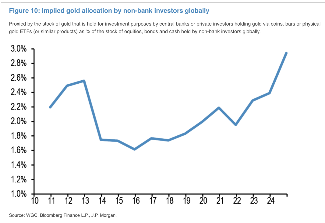 გაუფასურებაზე ვაჭრობის“ ტენდენცია გრძელვადიან პერსპექტივაში გაგრძელდება, რადგან ინვესტორთა პორტფელებში ოქროსა და Bitcoin-ის წილები იზრდება. ამის შესახებ JPMorgan-ის ანალიტიკოსებმა განაცხადეს, წერს The Block. „გასული წლის განმავლობაში ოქროს ფასების ზრდა ბევრად გასცდა აშშ დოლარისა და ობლიგაციების შემოსავლიანობის ცვლილებებს. ეს, სავარაუდოდ, ასახავს [რისკების ჰეჯირების სტრატეგიების] ხელახლა გაჩენას“, - აღნიშნეს ექსპერტებმა. 2024 წელს კრიპტოვალუტის ბაზარზე რეკორდული შემოდინება ასევე მიუთითებს იმაზე, რომ Bitcoin გახდა სტრუქტურულად მნიშვნელოვანი ინსტრუმენტი ბაზრის მონაწილეებისთვის. JPMorgan-მა გასულ წელს უწოდა "გადამწყვეტი წელი" ციფრული აქტივების ინდუსტრიისთვის. მათი გამოთვლებით, კაპიტალის მთლიანმა შემოდინებამ ამ მიმართულებით 12 თვის განმავლობაში შეადგინა დაახლოებით 78 მლრდ აშშ დოლარი. აქედან 27 მლრდ აშშ დოლარი მოდიოდა ETF-ებზე, 14 მლრდ აშშ დოლარი CME ფიუჩერსებზე, 14 მლრდ აშშ დოლარი კრიპტო ვენჩურულ ფონდებზე, 22 მლრდ აშშ დოლარი MicroStrategy-ს Bitcoin-ის შესყიდვებზე და 1 მლრდ აშშ დოლარი - მაინერების გარიგებებზე. ანალიტიკოსების თქმით, პორტფელებში ოქროს წილის ზრდა „აშკარაა“ ცენტრალური ბანკებისა და საცალო ინვესტორების მიერ ძვირფასი ლითონის ოდენობის შესწავლისას. ეს უკანასკნელი ჯგუფი იყენებს სხვადასხვა საწარმოო ინსტრუმენტს: ფიზიკურ ოქროს, ოქროს ETF-ებს და სხვა საინვესტიციო პროდუქტებს, რომლებიც ახლა მთელ მსოფლიოში არასაბანკო ინვესტორებს შორის მთლიანი მოცულობის მნიშვნელოვან პროცენტს შეადგენს. წყარო: The Block. შეგახსენებთ, რომ 2024 წლის ნოემბერში JPMorgan-ის ანალიტიკოსებმა ნდობა გამოხატეს პირველი კრიპტოვალუტისა და ოქროს „კარგ შედეგების“ მიმართ აშშ-ში დონალდ ტრამპის პრეზიდენტობის პერიოდში. https://tinyurl.com/6k4mm6xf