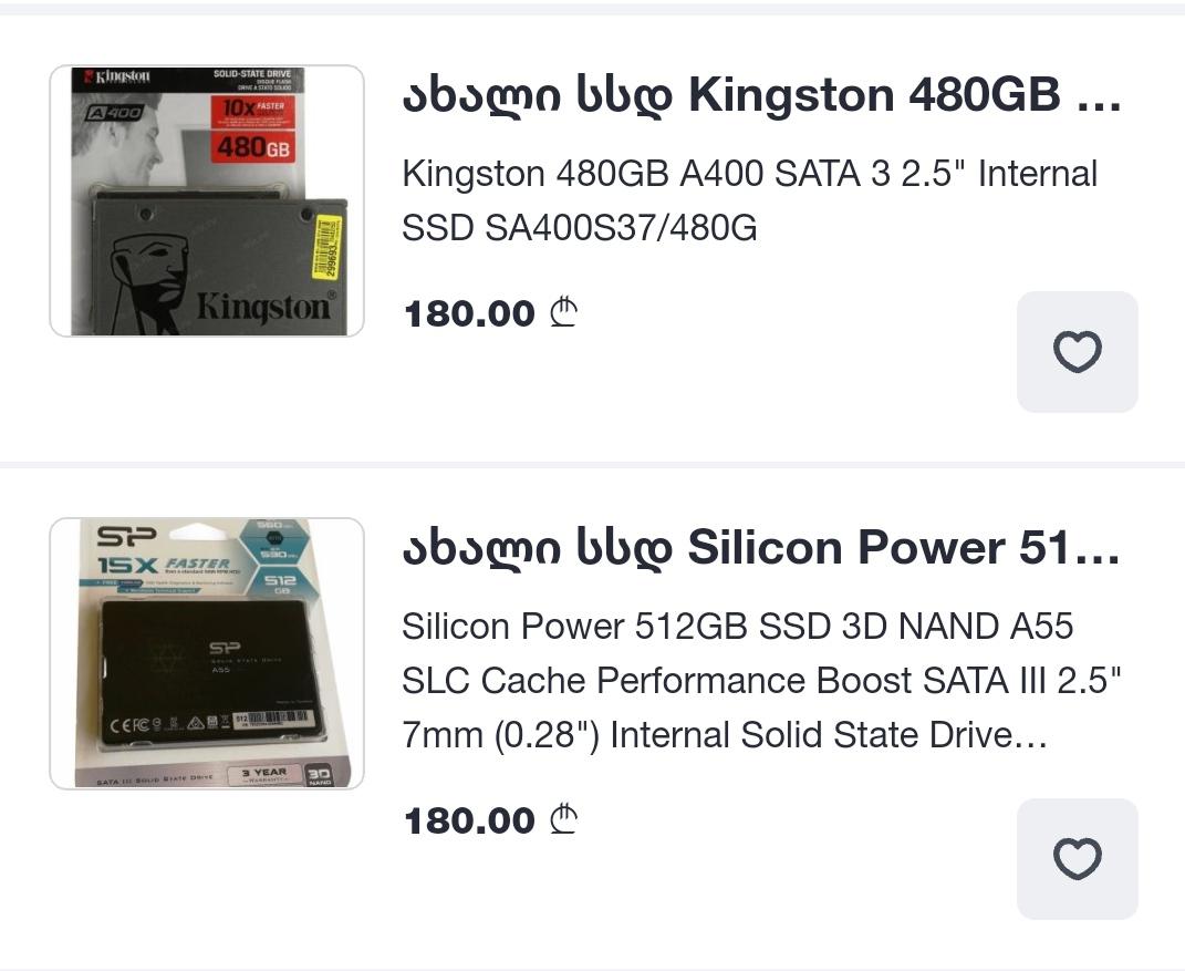 ჯორჯ, ის სამსუნგი აღარ არის მაიმარკეტზე 180 ლ 500 იანი... ეს კინგსტონები მხვდება ბევრი... რავიცი ბრენდია მაინც გამიგია და რავიცი ნორმალურია თუ იცი? Silicon Power ის თითქოს გამიგია. ის კი კაი ვარიანტია 260 ლ სულ ახალ 1 ტბ western digital ს ყიდის თუ ჩამივარდა ეგ თანხა. კი არა მედიას ონლაინ ვუყურებ არაფერს არ ვიწერ