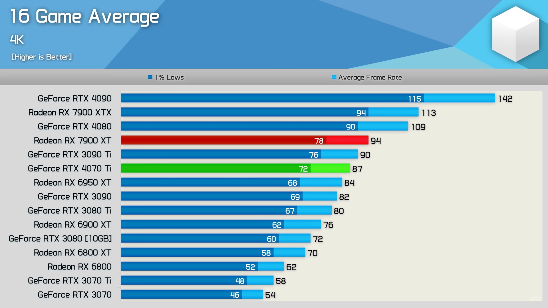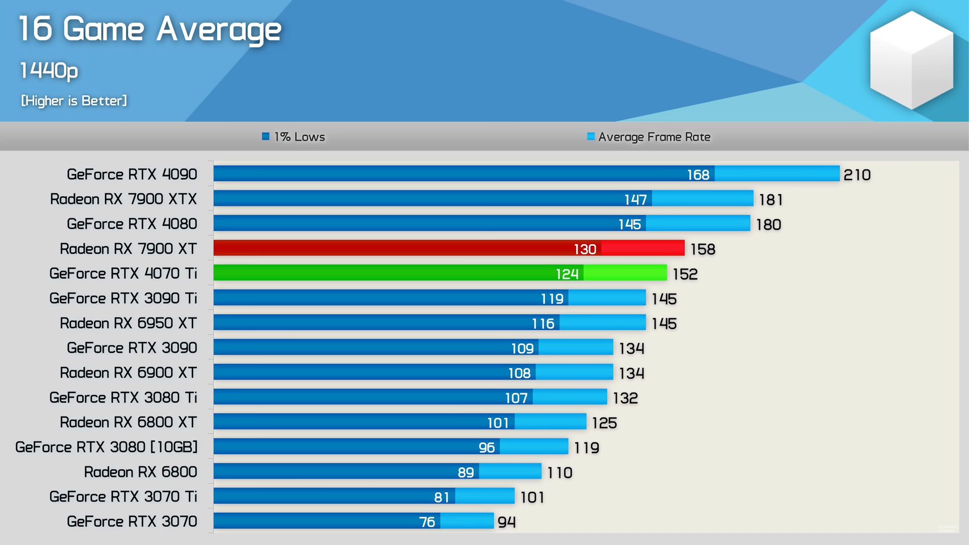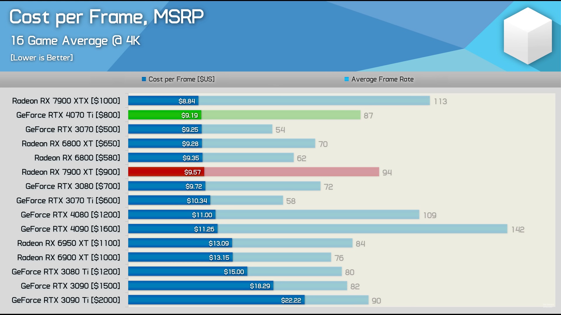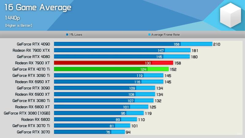 ვერც 3090TI-ს სჯობს და ვერც 4070TI-ს + ბევრად უკეთესი RT წარმადობა 1440-ში 4%-ით ჩამორჩება 100 დოლარით უფრო ძვირ 7900XT 4k-ში 7% უკეთეს cost per frame აქვს საერთოდ 4080, 4070 TI, 7900XTX,7900XT ყველაზე მოუწევთ ფასის დაკლება ადრე თუ გვიან გაყიდვებით თუ ვიმსჯელებთ ერთადერთი 4090 იყიდება ტემპში -