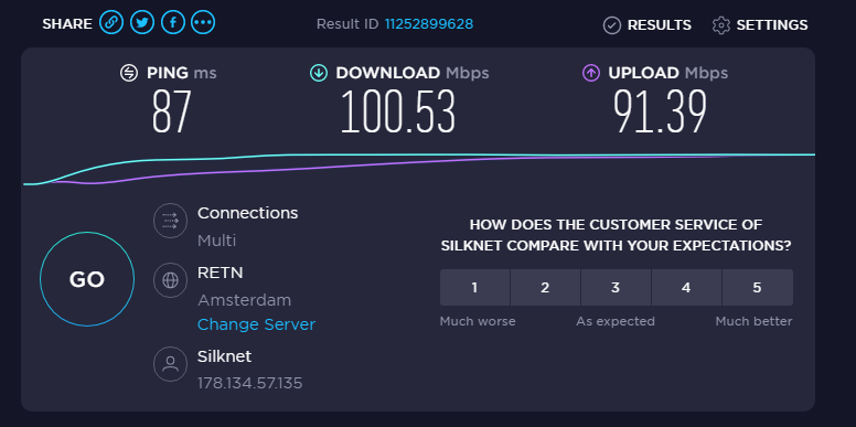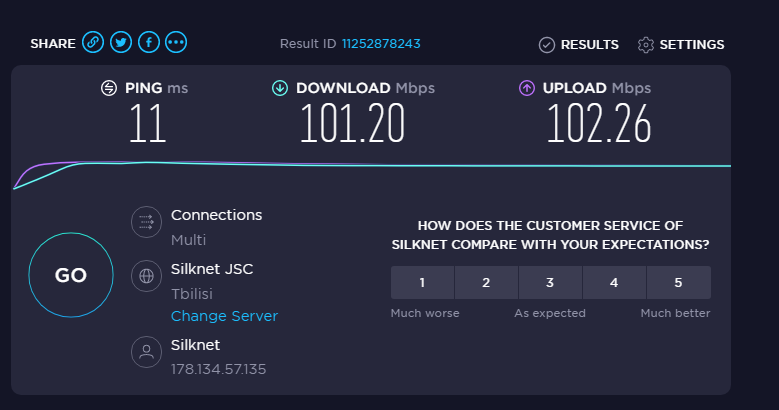 ზედა როცა სილკის სერვერს ვუკავშირდები ზუგდიდიდან, ქვედა როცა ამსტერდამის სერვერს. აქციით მაქ 34ლარად ტელევიზიასთან ერთად. ნოემბერში ჩავრთე მგონი, მანამდე მაგთი მქონდა მაგრამ გაფრთხილების გარეშე გამიზარდეს ფასი ერთხელ, მერე აქციის ვადაც გამივიდა და გადავედი სილკზე. ნოემბრისკენ ამასაც რო გაუვა აქციის ფასი ჩამოვა 20მბ-ზე მერე იმედია მაგთის ექნება ისევ რამე აქცია და ასე იქით აქეთ ვიმოგზაურებ