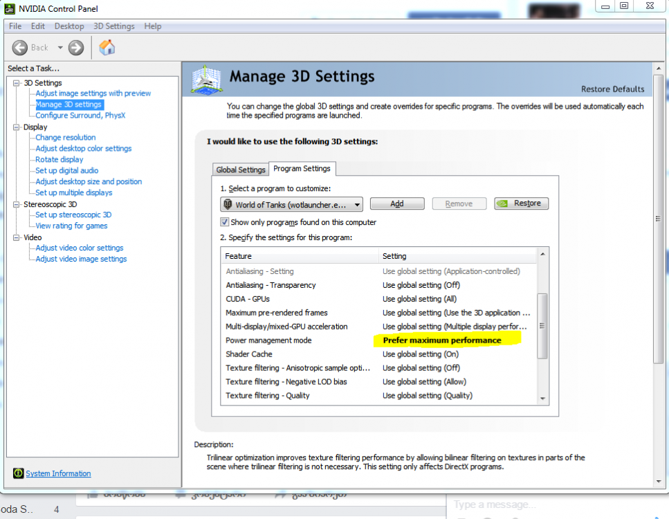 6. ტემპერატურა იდეალურია, 33 გრადუსი დაუტვირთავზე და მაქსიმუმ 60 დატვირთლზე. მემგონი მივხვდი რაშიცაა საქმე, ვიდეო კარტა ენერგიის დაზოგვის მიზნით თავისით აგდებს ქვემოთ სიხშირეებს და ზუსტად მაგას აკეთებს სავარაუდოდ თამაშის დროსაც და იმიტომაცაა ლაგი. ეხლა ნვიდია კონტროლ პანელიდან დავაყენე მაქსიმუმ პერფორმანსი და გავუთიშე ენერჯი სეივინგ მოუდი, world of tanks-ში მივუთითე ეგ და ეხლა გავტესტავ აბა თამაშის დროს. დავიზეპირე უცხოური ფორუმები ლამის, ნვიდია ინსპექტორი და რეებით აღარ ჩალიჩობს ხალხი რო ეს პრობლემა მოაგვაროს.