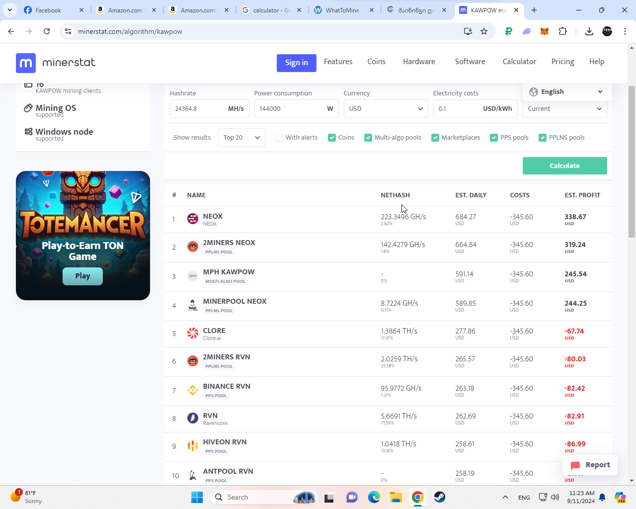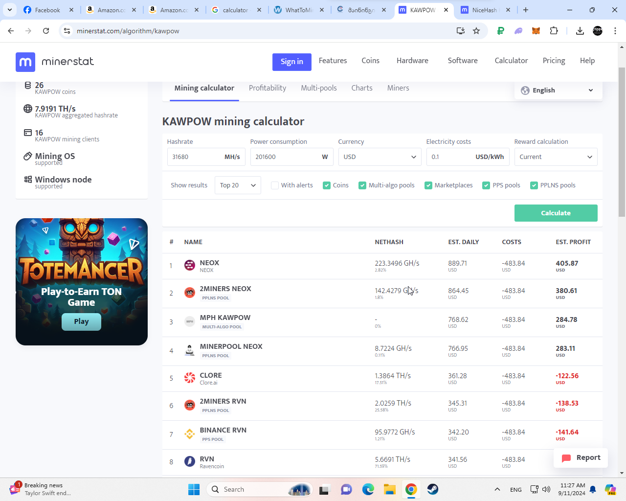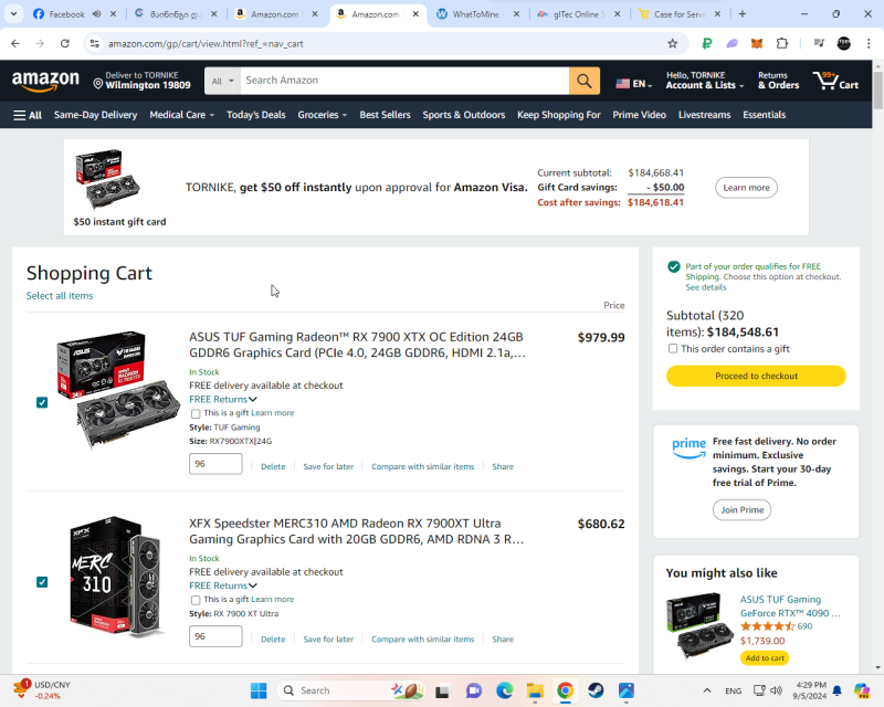 96 ცალი ASUS TUF Gaming Radeon™ RX 7900 XTX OC Edition 24GB GDDR6 Graphics Card (PCIe 4.0, 24GB GDDR6, HDMI 2.1a, DisplayPort 2.1)ASUS TUF Gaming Radeon™ RX 7900 XTX OC Edition 24GB GDDR6 Graphics Card (PCIe 4.0, 24GB GDDR6, HDMI 2.1a 96 ცალი ASUS TUF Gaming GeForce RTX™ 4070 Ti Super OG OC Edition Gaming Graphics Card (PCIe 4.0, 16GB GDDR6X 96 ცალი XFX Speedster MERC310 AMD Radeon RX 7900XT Ultra Gaming Graphics Card with 20GB GDDR6, ესენი ანუ 12 რამდენს წრს ეგ ვიანგარიშო და გადავამრავლო თორე ერთიანად ძაან მინუსში მაგდებს მგონი ამ სამი კოინიდან რომელიღაცა ღირს