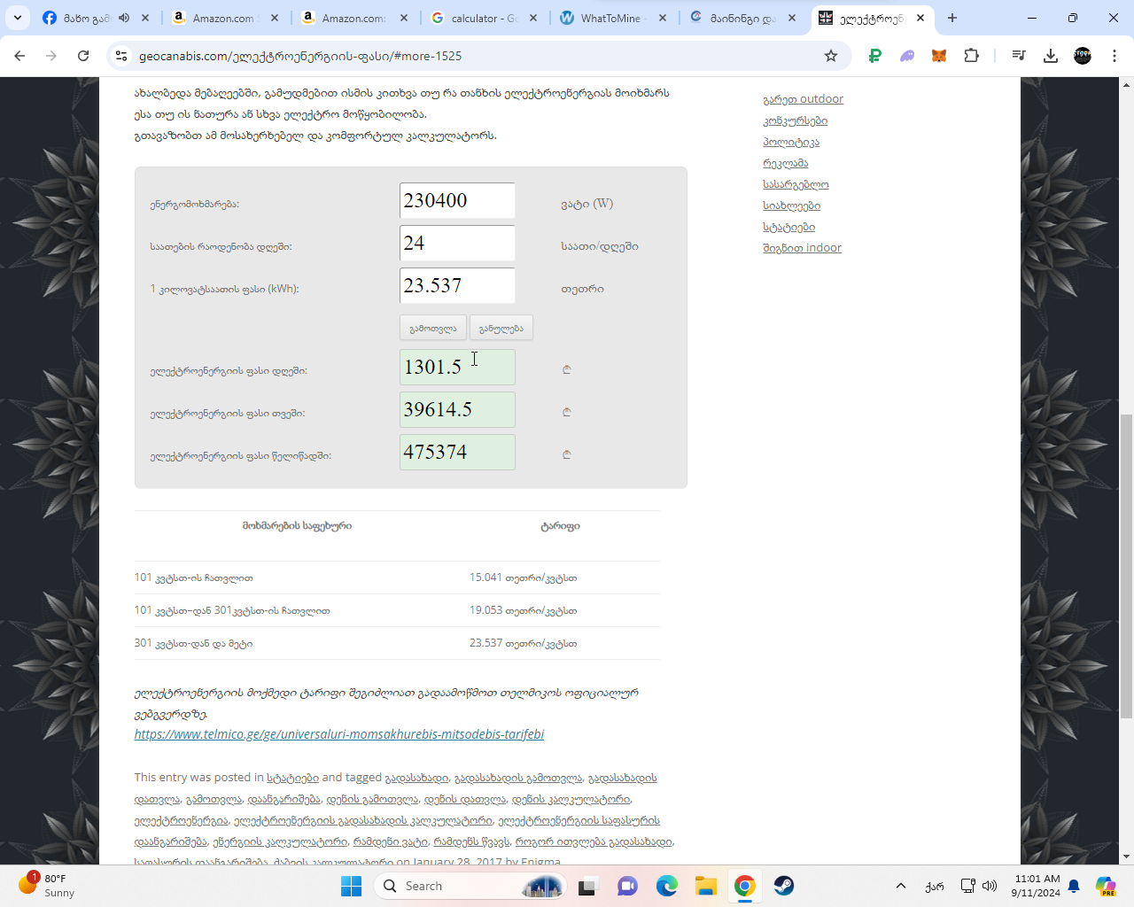 არა ესე წერს ვითვლი 4 კვვების ბლოკს 1200 ვატიანს ერთ მაზერზე 48 მაზერი 576 ვიდეო ბარათი და ეს ვატი უწევს ა 450 ლარს მინუს წერს სწორად თუ ვითვლი მარა 365 დღეზე 2 kawpows აი
