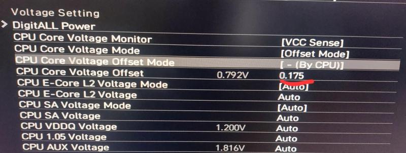 10. რავიცი მემგონი სწორად გავაკეთე ანდერვოლტი. -0.175 offset გავუკეთე და არც cinebench r23-ში არც ბლუსქრინს მიგდებს და არც იქრაშება. სტაბილურად მუშაობს. Cinebench-ში 78º -ზე ადის მაქსიმუმ. P1/P2 კიდევ 125w/150w ზე დავაყენე. Cinebench-ში აიღო 23737 ქულა. რავი, ხო სწორად გავაკეთე ანდერვოლტი? აგერ სქრინებიც: ღირს ვოლტაჟის კიდე დაწევა?