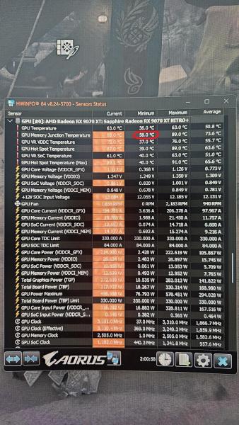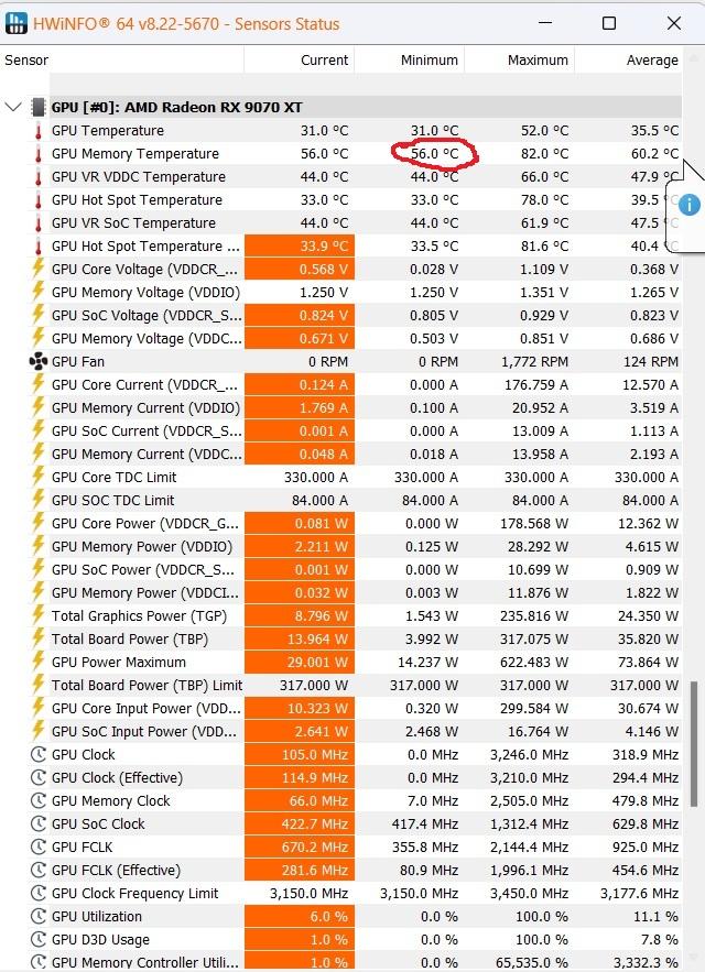 6. rx 9070 xt-ს hwinfo-ს სქრინები ვნახე ინტერნეტში და ამათაც 56-58 გრადუსი აქვთ idle-ში. ალბათ rx 9000-იან სერიებში vrm ცოტა მაღალ ტემპერატურებზე მუშაობს?