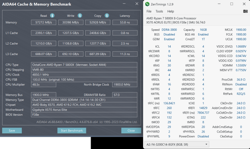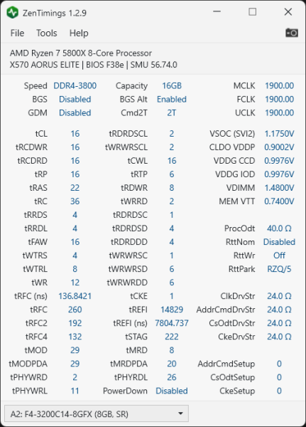 ამაზე რას იტყვით ბიჭებო? პროცესორი გამოვცვალე და შევავლე რამს ხელი. სპეციალურად ვიყიდე, თავის დროზე, samsung-ის b-die იანი ჩიპით. 1.47 ვოლტზეა. სტოკი cl14-3200 არის, 3600 იც ვცადე cl14-ზე, მაგრამ 3800 ამ ტაიმინგებით latency-შიც ჯობნიდა 3600-ს