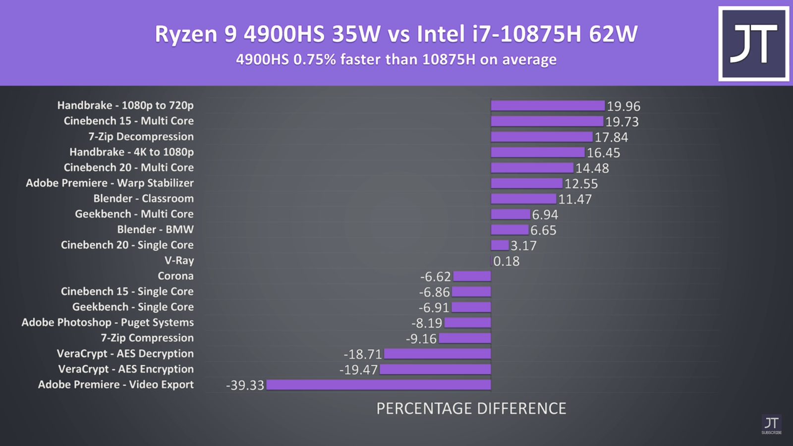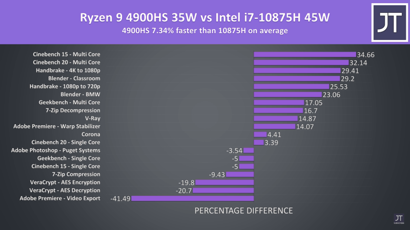 ჩემი დაცვა რად უნდა AMD-ს უბრალოდ ობიექტურად ვაფასებ სიტუაციას. მე ის უფრო მიკვირს ინტელზე რომ გაქვს ეგეთი დადებითი წარმოდგენა. AMD-მაც დადო მაგ პროცესორის კონკურენტი Ryzen 4900 HS, რომელიც მაგ ჩიპს თუ არ ჯობია არც ჩამორჩება მიუხედავად იმისა რომ 10 W-თ ნაკლები TDP აქვს 35W vs 45W და 1 GHZ-თ ნაკლები boost 4.3 GHZ vs ინტელის 5.3 GHZ + 2-ჯერ ნაკლები ქეში, მოკლედ აშკარად ტექნოლოგიურად AMD წინაა, წარმოიდგინე რას უზამდა პირიქით რომ იყოს 1 GHZ-ით მეტი ბუსტი რომ ქონდეს და მეტი power limit. 4900H-ს აქვს 45 W TDP და ეგ ჩიპი მაგ i7-საც დაჩაგრავს. ზუსტად მაგ ორის შედარება ვერ ვნახე მაგრამ აგერ 4900 HS vs 10875H. 5.1 GHZ აქვს ამ ინტელს ბუსტი და მაინც მაგ 4900 HS-მა აჯობა 7.34%-თ. შენი აზრით იქნება მაგხელა სხვაობა 10875H-სა და 10980HK-ს შორის? არამგონია. 200 MHZ boost მაგხელა წინსვლას ვერ მიცემს მაგ ინტელს. ძალიან ძლიერი IPC აქვს მაგ AMD-ეს ახალ სერიას, შეიძლება ინტელის 10 სერიას ჯობია კიდეც, რადგან სიხშირეში ამხელა სხვაობის მიუხედავად მაგ პროცესორის ჯობნა ხუმრობა არაა. ამ შედარებაში შენ ძალიან მნიშვნელოვან რამეს არ ითვალისწინებ, ფასს. AMD ზოგადად ძალიან იაფია და ლეპოტპებსაც ძალიან აიაფებს. რავი შენ თუ 2 ბირთვიან i3-ებში მოგწონდა 300 ლარების გადახდა და 4 ბირთვიან i7-ებში სამჯერ მეტის, მაშინ გასაგებია ინტელი რატომ მოგწონს, მაგრამ ობიექტურად რომ შევაფასოდ დღეს AMD გაცილებით უკეთესი არჩევანია და ამას აგერ უამრავი ტესტები ამტკიცებს. + ყველა ცნობილი ტექ youtube-რი ყველას AMDს ურჩევს, მაგათ კიდევ შენზე და ჩემზე გაცილებით მეტ მასეთ ტექნიკასთან აქვთ შეხება. ეს power limit გაზრდილი i7 სადაც მაინც აჯობა, თუმცა adobe premier ანუ intel quicksync რომ არა 3%-თ სწრაფი იქნებოდა, მაგრამ აქ ნახე რამდენ დენს მოიხმარს და როგორ ცხელდება დაბლა დავდებ სურათებს ეს ნახე რამხელა დენს მოიხმარდა მაგ ტესტში ინტელის ლეპტოპი ეს კიდევ რა ტემპერატურებზე მუშაობდნენ