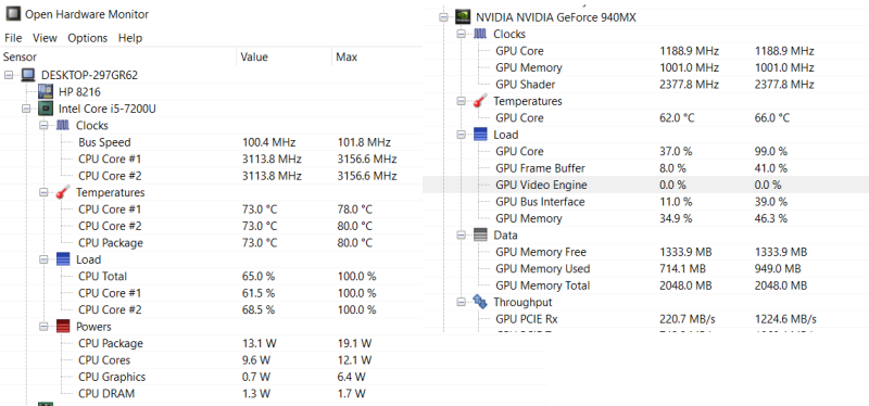 17. ეს თამაშის დროს cpu და gpu დატვირთულზე, ვიდეო კარტამ გამაკვირვა მემგონი იდეალური ტემპერატურაა ამ სიძველის და გაგრილების ვიდეო კარტისთვის, ისე ქვედა კორპუსი მოხსნილი მაქვს ლეპტოპის მარა მაინც ისე დევს დიდი განსხვავება არ უნდა იყოს წესით. მაქსიმეუმზეც კი 66 გრადუსი დააფიქსირა