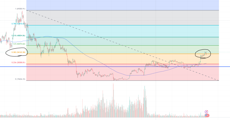 36 000-ის ზევით მაგარი Bullish-ია. ეგ არის Fibonacci-ს პირველი მნიშვნელოვანი დონე. თან ეს Halving-ის თემა ემატება... დღეს ვერ მოვასწარი 35500-ზე მინდოდა დალონგვა მცირე სტოპ ლოსით... თუ ვინმეს დაშორტვა უნდოდა, აქამდე უნდა დაეშორტა,(სანამ მაგ 36 000 დონეს გაარღვევდა) ახლა შორტს აღარ გახსნის აღარავინ, სანამ შემდეგ დონეებამდე არ მივა.