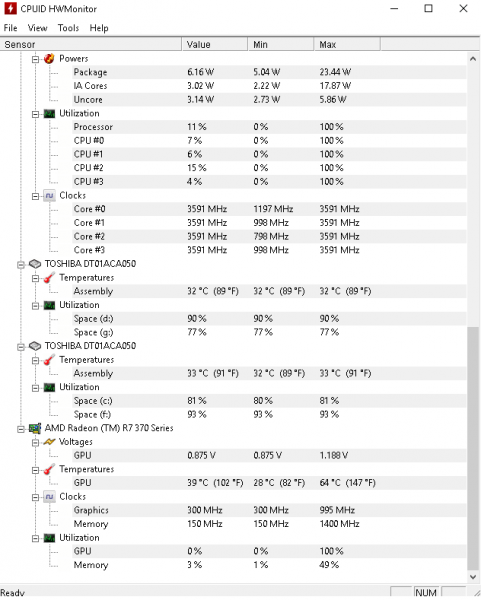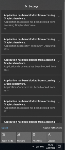 გამარჯობა, მქონდა Nvidia Geforce 740 რომელიც უშვებდა ყველა თამაშს (ახალ თამაშებს დაბალ FPS - ზე). მაჩუქეს AMD rR7 370 რომელიც გამოიყენებოდა მაინინგისთვის. Apex Legends (ვიდეოთამაში) პირველ ჩართვაზე ჩვეულებრივ ჩაირთო და 2 - 3 ხელი ვითამაშე. შემდეგი ხელის ჩატვირთვის დროს გაითიშა შეცდომით: "application has been blocked from accessing graphics hardware". ეს შეცდომა ჩნდება რამდენიმე თამაშზე. დრაივერს დავაბრალე, შედარებით ძველი ვერსია (16.4) დავაყენე და ნორმალურად ჩაირთო თავიდან, შემდეგ ისევ გაჭედვა დაიწყო. როგორც შევამჩნიე თავიდან რესტარტის დროს ნორმალურად მუშაობს დაახლოებით 5 წუთამდე, შემდეგ ამ შეცდომით გამოდის. გადავქექე ინგლისურენოვანი საიტები console ში ბრძანებების ჩაწერამ, დრაივერის რეინსტალაციამ GameDVR ის გათიშვამ და მსგავსმა რაღაცებმა ვერ უშველა. ეს არის ბოლოს თამაშიდან "გამოგდების" შემდეგ გადაღებული HWMonitor ის შედეგი. ვიფიქრე იქნებ ხურდება და ჰარდვეარის ბრალია მეთქი მაგრამ ტემპერატურა ნორმალურია: Assassin's creed odyssey ზეც იგივე ემართება. ასევე მივამაგრებ შეცდომებსაც. არ ვიცი რატომ მაგრამ სხვადასხვა აპლიკაციებზე ბლოკავს. ქრომზეც გამომიტანა ერთხელ მსგავსი შეცდომა მაგრამ ქრომი ჩვეულებრივ მუშაობს ამ შეცდომის მიუხედავად. თამაშები მომენტალურად იქრეშება.