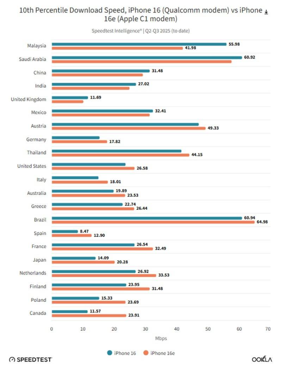 შედეგები განსხვავდება ოპერატორისა და ქვეყნის მიხედვით და ზოგიერთ შემთხვევაში Apple C1 რეალურად უკეთესად მუშაობს. მაგალითად, აშშ-ში T-Mobile-ის 5G ქსელში iPhone 16-ისთვის საშუალო ჩამოტვირთვის სიჩქარე იყო 317 მბ/წმ, iPhone 16e-სთვის - 252 მბ/წმ. თუმცა, ესპანეთში iPhone 16e-მ უკეთესი შედეგი აჩვენა - 139 მბ/წმ მოდელ 16-ის 110 მბ/წმ-თან შედარებით.