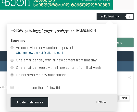 ყველაფერზე მეილები მომდის და ვერ ვთიშავს, დროებითია თუ სუ ეგრე იქნება? რომელ თემაზეც follow მაქ გაკეთებული მაგ თემაში თუ ვინმე დაპოსტავს ეგრევე ფოსტაზე  მომდის და გათიშვის ფუნქცია გაუქმებულია სეთინგებში