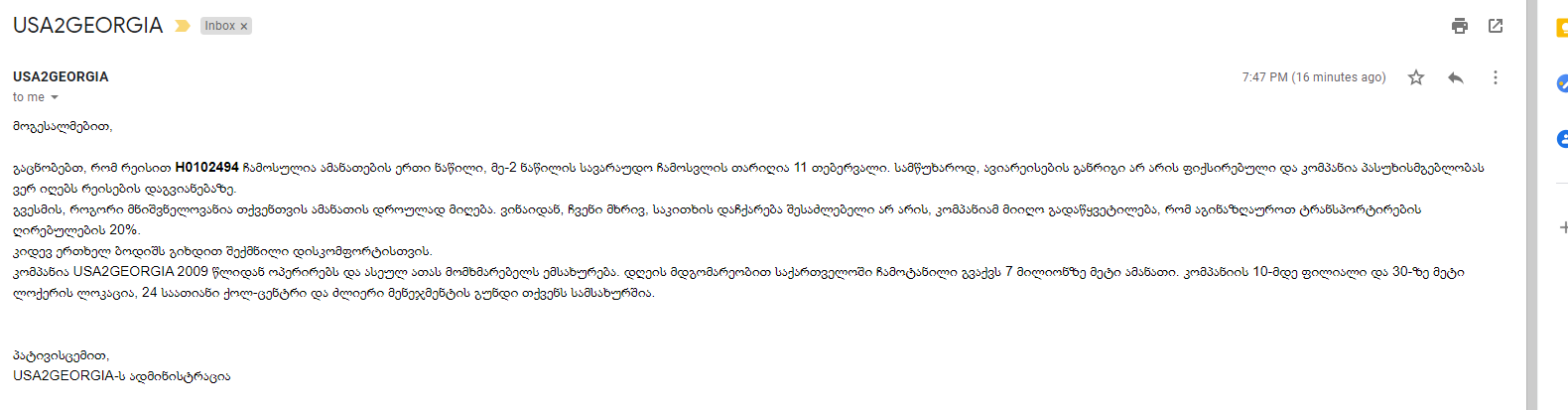 david_888 Posted December 12, 2016 Posted December 12, 2016 16 minutes ago, Eip Ococh said: მისულია. უბრალოდ ეგენი არ მუშაობენ შაბათ-კვირას და მაგიტო არგიჩანს სისტემაში. შაბათს მიდის ამანათები კვირას არა. ორშაბათს მოგწერენ დაადეკლარირეთო რავი ვკითხე და შაბათს არ ვიღებთ ამანათებსო მიპასუხეს, თუ მართლა მისულია მასინ დღეს გამოგზავნილებში უნდა აისახოს უკვე Quote