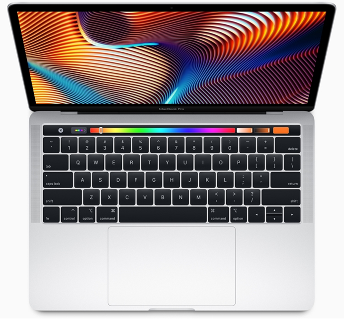 განახლებული MacBook Pro 13.3-დუიმიანი True Tone ეკრანით (2560 × 1600 პიქსელი) დაკომპლექტებული ოთხბირთვიანი, მერვე თაობის Intel Core პროცესორით, აქვს Touch Bar პანელი, სენსორი Touch ID და ჩიპი Apple T2 Security Chip.