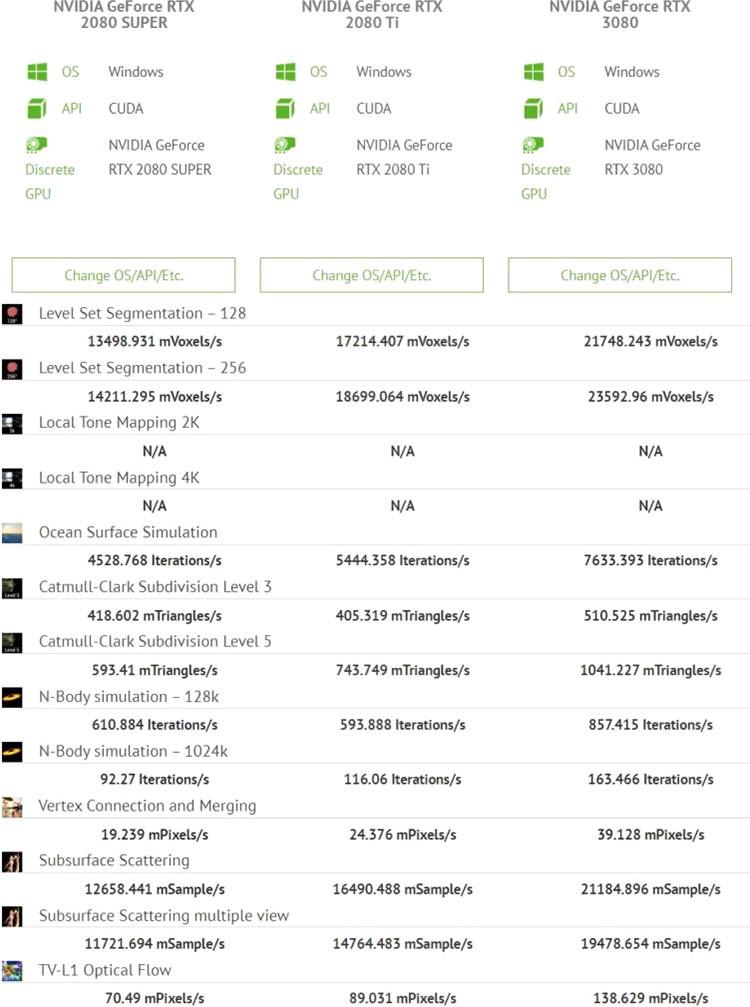 VideoCardz-ის წარმომადგენლებმა შეაგროვეს მონაცემები CUDA და OpenCL ტესტებისთვის. ორივე ტესტის საშუალო მაჩვენებელი მეტნაკლებად მსგავსია. GeForce RTX 3080 დაფას საშუალოდ შეუძლია 68%-ით მეტი წარმადობის დემონსტრირება RTX 2080-ან შედარებით და 38-41%-ით მეტი - RTX 2080 Ti დაფასთან შედარებით.