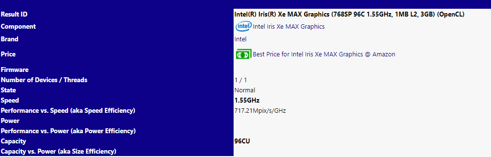 ამჟამად არსებულ Iris Xe მოდელებში გრაფიკული ბირთვის მაქსიმალური სიხშირე არ აღემატება 1.35 გჰც-ს, რაც არც ისე ბევრია. თუმცა Intel-მა ადრე შემხვევით გაამხილა უფრო მძლავრი Iris Xe MAX ვერსიის არსებობა, რომელიც ახლახანს გამოჩნდა კიდეც SiSoftware-ის მონაცემთა ბაზაში. გრაფიკული ჩიპის გაუმჯობესებულ ვერსიას აქვს 1.55 გჰც სიხშირე, რაც 200 მეგაჰერცით მეტია ამჟამად არსებულ მოდელთან შედარებით.