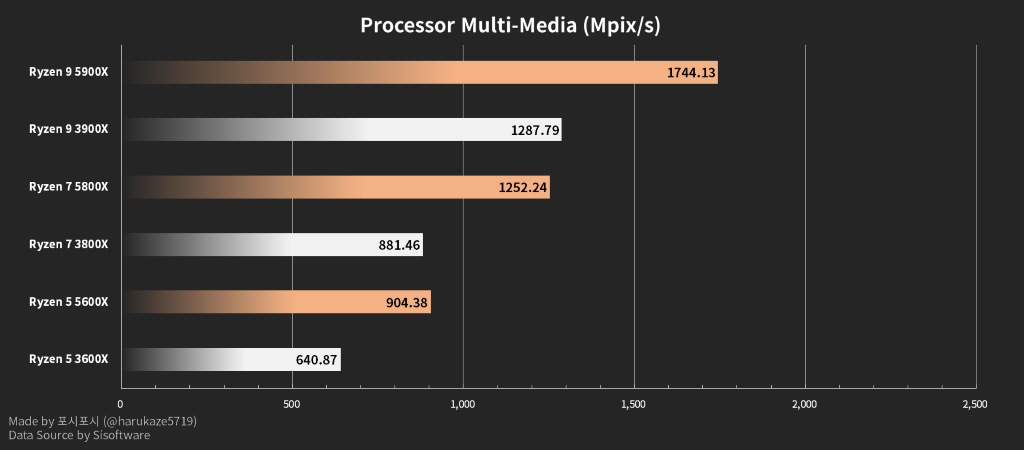 მულტიმედია გამოთვლებში იგრძნობა უფრო მეტი უპირატესობა - არქიტექტურა Zen 3 დაახლოებით 25-30%-ით სწრაფი აღმოჩნდა კონფიგურაციების მიხედვით.