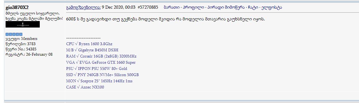 George Posted December 8, 2020 Posted December 8, 2020 ხო ესე იგი საყიდელი გქონია 1500 ლარის ფარგლებში კარტა, რავიცი მე 5700 აღებას ისევ 1080Ti ავიღებდი, რომ ვუყურებ ბენჩებს ლამის 2080 ეჭირდავება ეგ კარტა ბევრ თამასში დაჟე 2K კი, ეგეთი კარტები კი 2000 ლარი და ზევით ჯდებიან, რა მნიშვნელობა აქვს მერე გადაცვლი 3060Ti თუ არა, ეხლა ხომ ხოშიან ფორმაში იქნება, მეორე მხრივ 75 გერციან 1080P თუ მაქსიმუმ მაგას თრეულობ გეყოფა 5700 რა თქმა უნდა, მოკლეთ შენი გადასაწყვეტია, მთავარია მანდ მაინც კარგ ფორმაში ჩაგივარდეს, სხვა მხრივ ცუდი არცერთი არ უნდა იყოს მაგ ფაფართოვებაზე, ფრისინკიანი მონიკი კიდე ერთზეც იმუშავებს და მეორეზეც, ჩემიც ფრისინკია და მშვენივრათ უბერავს 1080-ზეც და 1080Ti ეგეთი Dp 1.4 10bit 165 გერცი+ HDR მეტი რაღა უნდა მოსთხოვო აბა არა Gsync მონიკს
