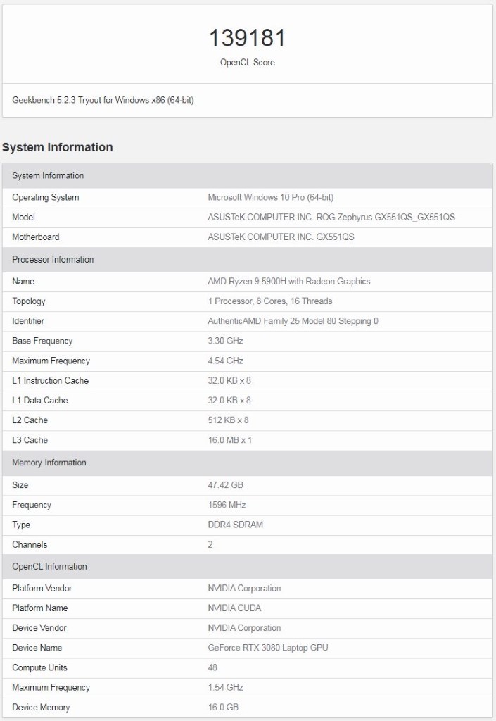 წარმოდგენილი მონაცემებიდან გამომდინარე, მობილურ GeForce RTX 3080-ს აქვს GPU 6144 აქტიური CUDA ბირთვით (მაქსიმალური სიხშირე 1.54 გჰც), აგრეთვე 16 გბ ვიდეომეხსიერება. ASUS-ის მიერ წარმოებულ ROG Zephyrus სერიის ლეპტოპში ახალ ვიდეო დაფასთან ერთად წარმოდგენილია 8-ბირთვიანი, 16-ნაკადიანი პროცესორი AMD Ryzen 9 5900H, ასევე DDR4 ტიპის 48 გბ ოპერატიული მეხსიერება ეფექტური 3200 მჰც სიხშირით.