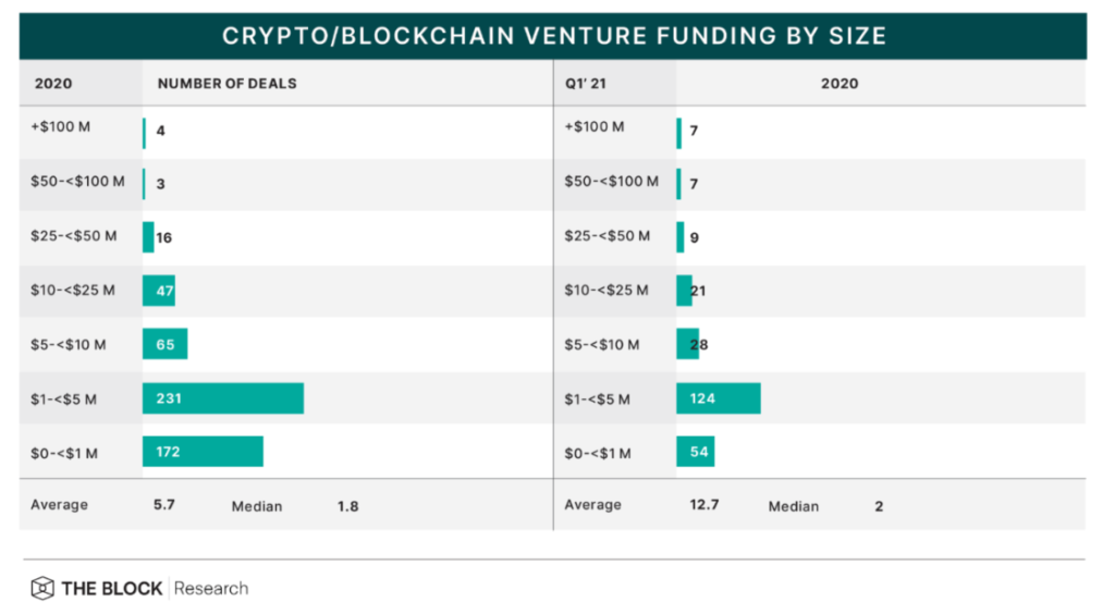 2021 წლის პირველ კვარტალში კრიპტოავალუტო კომპანიებმა ვენჩურული ინვესტორებისგან მოიზიდეს 50 მლნ აშშ დოლარი და მეტი 2020 წელთან შედარებით ორჯერ უფრო ხშირად. ამას მოწმობს The Block Research-ის მონაცემები.