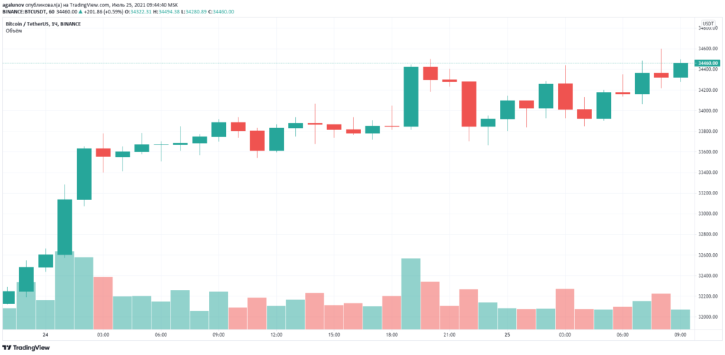 კვირას, 25 ივლისს, Bitcoin-ის ფასმა გადააჭარბა 34400 $-იან დონეს. CoinGecko-ს თანახმად დღე-ღამის განმავლობაში აქტივის კვოტირება გაიზარდა თითქმის 2%-ით, კვირის განმავლობაში - 9%-ით. სტატიის მომზადების დროს ციფრული ოქრო 34 460 აშშ დოლარად იყიდებოდა.