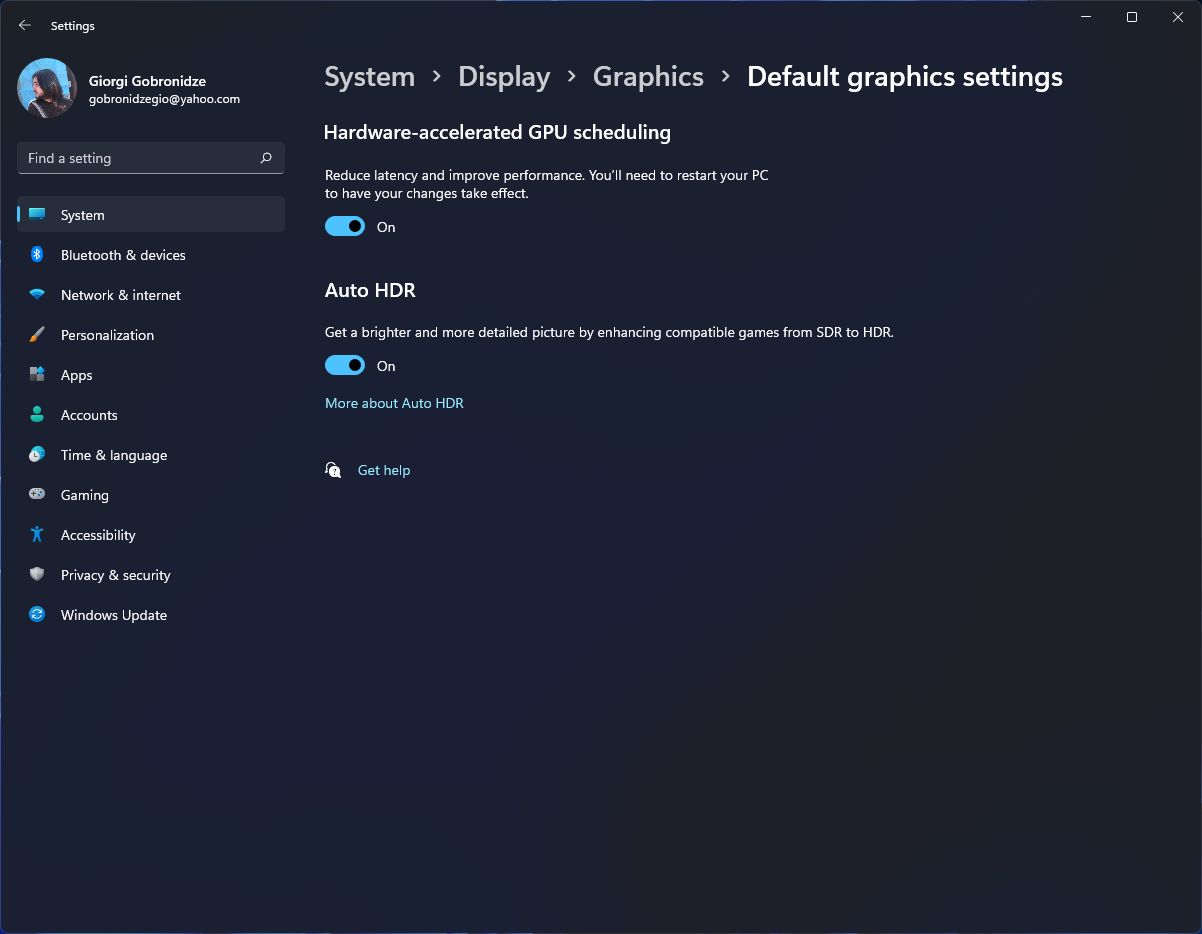 Gobro Posted December 5, 2021 Posted December 5, 2021 11 hours ago, George said: HDR სად გლობალურათ თუ msi აფტერბარნერში რომ დაამატეს, ბრაუზერში პროფილში რაზე გიყენია performance თუ adaptive-ზე ნვიდიას კონტროლ პანელიდან, მერე აქ ნახე რამე პერფორმანსზე ხომ არ აყენია,თუ კი ჩამოწიე, ნვიდიას კონტროლ პანელში გამოაჩინე რა იყენებს მაგ დროს ვიდეოკარტას და მიხვდები რისი ბრალი შეიძლება იყოს უფრო აი ამას ვგულისხმობ: HDR გლობალურათ ჩართვას მე არ გირჩევდი, ავტომატურათ არ ირთვება შენ მონიკზე იგრებში და ვიდეოებზე, ჩემთან კი, ნუ MPC-HC+madVR-ზე მუშაობს ავტომატური გადართვა უპრობლემოთ და იგრებშიც სადაც არის HDR, თუ აუტო-HDR და ბრაუზერის HDR გინდოდა, რავიცი თუ ახურებს ჯობია გამოურთო ეგ, ან მაშინ ჩართო როცა გჭირდება რეალურათ HDR ჩართვა, ბრაუზერი იქნება თუ თამაში ან ფილმი, ფილმებზე დავწერე უკვე, MPC-HC+madvr თავისით ირთვება პოლნი ეკრანზე HDR, ვინდოუსიდან ჩართვა არაა საჭირო, იგრებშიც წესით უნდა ირთვებოდეს ბევრგან, მონიკზეა ალბათ დამოკიდებული MSI აფტერბარნერში არაფერს შევხებილვარ. Nvidia-ს კონრტოლ პანელში ყველაფერი რიგზეა. ეს გლობალურ HDR რას გულისხმობ? ვინდოუსიდან რომ ირთვება ალბათ მაგას ხო? მე აი აქედან მაქვს ჩართული HDR დაკვირვებული ვარ ყველაფერი უცნაური მე უნდ დამემართოს Quote