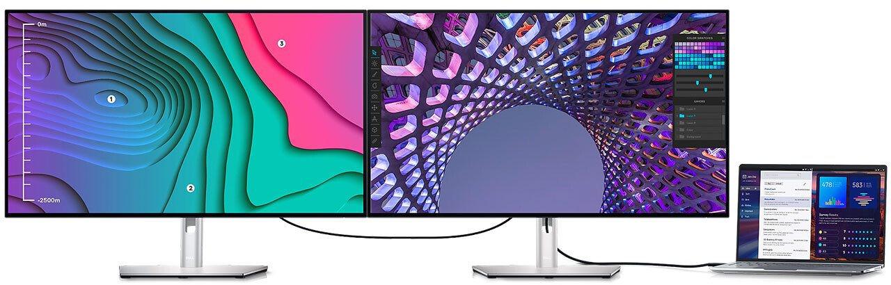 ახალ U2723QE და U3223QE მოდელებს აქვთ ექვსპორტიანი USB-ჰაბი USB 3.2 Gen 2 (10 გბ/წმ), ამასთან მთავარ USB-C პორტს შეუძლია უზრუნველყოს 90 ვატი სიმძავრე USB-PD-ის მევეობით, აგრეთვე მხარდაჭერილია ალტერნატიული რეჟიმი DP 1.4. USB ჰაბი მუშაობს KVM რეჟიმში, რომელიც დღეისათვის სტანდარტული ფუნქცია ხდება მაღალი დონის ბევრი დისპლეის შემთხვევაში. ერთი USB 3.2 Gen 2 შემოიფარგლება მხოლოდ 15 ვატით, მეორე USB 3.2 Gen 2 პორტი განკუთვნილია მხოლოდ USB მონაცემების სიგნალებისთვის. მონიტორების ტრადიციულ ინტერფეისებში შედის HDMI 2.0, DP 1.4, აგრეთვე დისპლეის დაკავშირებისთვის საჭირო ინტერფეისი. აგრეთვე ხელმისაწვდომია RJ45 სადენიანი ქსელისთვის და 3.5-მილიმეტრიანი აუდიოკონექტორი.