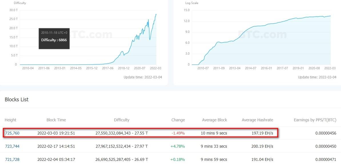 დაახლოებით ორკვირიან პერიოდში, რომელიც ყოფს მაჩვენებლის გადაანგარიშებებს, საშუალო ჰეშრეითმა შეადგინა დაახლოებით 197 EH/s - წინა დროის მონაკვეთში ეს მაჩვენებელი 200 EH/s იყო. იმ დროს სირთულის მხრივ დაფიქსირდა ისტორიული მაქსიმუმი - 29.97 Т.