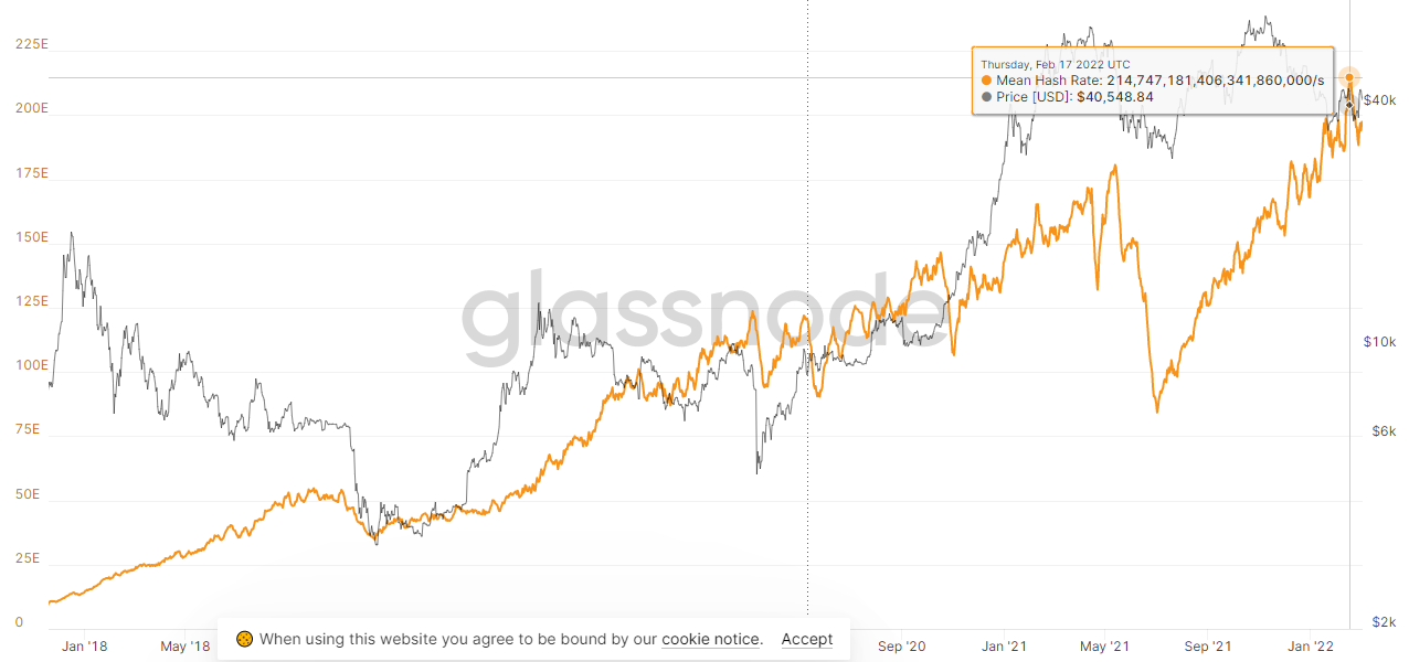 Glassnode-ის თანახმად Bitcoin-ის ქსელის გამომთვლელი სიმძლავრის ცვლადმა შვიდდღიანმა საშუალო მაჩვენებელმა მიაღწია 17 თებერვლის მაქსიმუმს, 214.7 EH/s-ს, შემდეგ კი კლებისკენ გადავიდა.