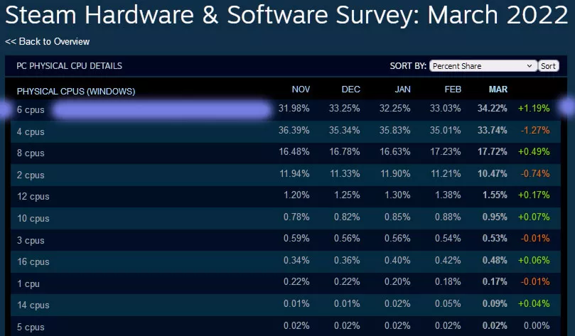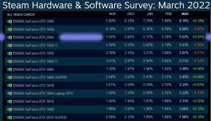 Magdalena Posted April 6, 2022 Posted April 6, 2022 Steam-მა გამოაქვეყნა მიმდინარე წლის მარტში გამოყენებული ცენტრალური პროცესორებისა და გრაფიკული ამაჩქარებლების სტატისტიკა. პირველ რიგში, მნიშვნელოვანი ცვლილება მოხდა გამოყენებული CPU-ების სტატისტიკაში, რადგანაც ექვსბირთვიანმა ჩიპებმა პირველად დაიკავა ლიდერის პოზიცია, ოთხბირთვიანმა პროცესორებმა კი მეორე ადგილზე გადაინაცვლა. მეორე, Nvidia GeForce RTX 2060 ცდილობს გრაფიკული ადაპტერების მწვერვალის დაპყრობას - ვიდეო დაფამ მესამე ადგილზე გადაინაცვლა. Steam Hardware Survey-ის უახლესი მონაცემები აჩვენებს, რომ ამ პოპულარულ პლატფორმაზე უფრო მეტი გეიმერია წარმოდგენილი ექვსბირთვიანი პროცესორებით, ვიდრე ოთხბირთვიანი პროცესორების მფლობელები. უახლესი მონაცემები გვიჩვენებს, რომ ექვსი ან მეტი ფიზიკური ბირთვის მქონე პროცესორები შეადგენენ მომხმარებლის ბაზის 34.22%-ს, ხოლო მომხმარებელთა 33.74% სარგებლობს ოთხი ფიზიკური ბირთვის მქონე კომპიუტერებით. ექვსბირთვიანი პროცესორების წილის ზრდა საკმაოდ სწრაფია. არქივების მიხედვით ადრე დომინირებდა ოთხბირთვიანი ჩიპები, რომლებზეც Steam-ის მომხმარებელთა 41.61%-იანი წილი მოდიოდა. მონაცემები ასევე მიუთითებს რვა ბირთვიანი პროცესორების რაოდენობის სტაბილურ ზრდაზე, ექვს ან მეტბირთვიანი პროცესორების წილი მართლაც კარგად გაიზარდა (გარდა უჩვეულო კონფიგურაციებისა, როგორიცაა 1.3- ან 5-ბირთვიანი პროცესორები). დაახლოებით ერთი თვის წინ Nvidia GeForce GTX 1060 ყველაზე პოპულარული გრაფიკული დაფა იყო Steam-ის მომხმარებლებს შორის. 2022 წლის დასაწყისში მას რამდენიმე პროცენტი დაემატა. შესაძლოა, ეს გამოწვეულია იმით, რომ GPU მოთხოვნადი გახდა მეორად ბაზარზე. მარტში ამ მოდელის წილი კვლავ გაიზარდა და შეინარჩუნა ლიდერობა ბაზარზე 8.18%-იანი წილით. რატომ ვერ დაიკავა GeForce RTX 2060-მა პირველი ადგილი მას შემდეგ, რაც Nvidia გულმოდგინედ მოამზადა იგი, როგორც GTX 1060-ის მემკვიდრე? ამ კითხვაზე პასუხი, ალბათ, მდგომარეობს ნახევარგამტარი კომპონენტების დეფიციტის, Covid-19-ის, სკალპინგისა და კრიპტო მაინინგის ერთობლიობაში - ამ ყველაფერმა განაპირობა ის, რომ ბოლო წლების განმავლობაში გრაფიკული ადაპტერები სათანადოდ ვერ მოხვდა გეიმერების ხელში. მარტში RTX 2060 მეოთხედან მესამე ადგილზე გადავიდა და უკან მოიტოვა GeForce GTX 1050 Ti. რთულია თქმა, ავა თუ არა ოდესმე RTX 2060 პირველ ადგილზე. Turing არქიტექტურაზე დამყარებული ეს ვიდეო დაფა ლიდერს დაახლოებით 2.5%-ით ჩამორჩება. Ampere GeForce RTX 3060-მა მეშვიდე ადგილი დაიკავა, ორჯერ უფრო სწრაფად გაიზარდა მისი წილი, ვიდრე RTX 2060 დაფისა მარტში. ასე რომ, დიდი ალბათობით, ახალი ლიდერი გახდება არა მოძველებული 2060, ა