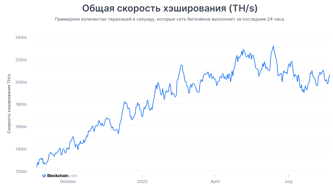 ქსელის ჰეშრეითი ივლისის შუა პერიოდში მიღწეული მაქსიმალური 231.4 EH/s-დან 206 EH/s-ამდე შემცირდა.