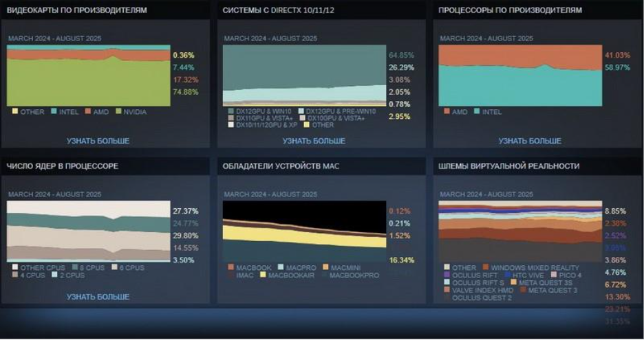 Magdalena Posted September 5, 2025 Posted September 5, 2025 GeForce RTX 4060 Steam-ზე ყველაზე პოპულარული ვიდეო ბარათი გახდა, Windows 11-ის წილმა პირველად გადააჭარბა 60%-ს გეიმინგ პლატფორმა Steam-მააგვისტოს თვის მომხმარებლების კომპიუტერული კონფიგურაციების შესახებ ახალი სტატისტიკა გამოაქვეყნა. ბოლო თვის განმავლობაში პლატფორმის ყველაზე პოპულარული ვიდეო ბარათი შეიცვალა და Windows 11-ის წილმა პირველად გადააჭარბა 60%-ს. ფოტოს წყარო: Steam Nvidia-ს ვიდეო ბარათები კვლავ დომინირებენ Steam-ზე. თვის განმავლობაში მათი წილი 1%-ით გაიზარდა და 74.9%-ს მიაღწია. AMD-ის და Intel-ის ვიდეო ბარათების წილი შემცირდა - ორივე 0.5%-ით. ამრიგად, Radeon ვიდეო ბარათებს გამოკითხვის მონაწილეთა 17.3% იყენებს (ერთი თვით ადრე 17.8% იყო), ხოლო Intel Arc-ს - 7.4% (ივლისში არსებული 7.9%-ის ნაცვლად). Steam-ზე ყველაზე პოპულარული ვიდეო ბარათი გახდა GeForce RTX 4060. აგვისტოში მისმა წილმა 4.85%-ს მიაღწია (+0.46% თვეში). მეორე ადგილზე იყო GeForce RTX 3060 4.79%-იანი წილით (+0.17% თვეში). მესამე ადგილზეა GeForce RTX 4060-ის მობილური ვერსია 4.62%-იანი წილით (+0.19% თვეში). ინტეგრირებული გრაფიკის გამოკლებით AMD-ის ყველაზე პოპულარული ვიდეო ბარათია Radeon RX 6600. პლატფორმაზე მისი წილი 0.89%-ია (-0.03% თვეში). Steam-ის სტატისტიკაში ასევე გამოჩნდა Radeon RX 9000 ვიდეო ბარათები - RX 9070-ს მომხმარებელთა 0.2% იყენებს, ხოლო RX 9070 GRE-ს - 0.02%. პროცესორების სეგმენტში Intel-ის ჩიპების მომხმარებელთა წილი უმნიშვნელოდ გაიზარდა. ბოლო თვის შედეგების მიხედვით გამოკითხვის მონაწილეთა 59.76%-მა განაცხადა, რომ იყენებს ამ პროცესორებს. თვის განმავლობაში ზრდამ 0.24% შეადგინა. თავის მხრივ, AMD-ის პროცესორების მომხმარებელთა წილი 40.16%-მდე შემცირდა (თვეში -0.23%). Steam პლატფორმაზე Windows 11-ის მომხმარებელთა წილმა პირველად გადააჭარბა 60%-ს. შესაბამისად, Windows 10-ის წილი 35.08%-მდე შემცირდა. ცხადია, ამ გადასვლას ხელს უწყობს ის ფაქტი, რომ Microsoft შეწყვეტს Windows 10-ის მხარდაჭერას მიმდინარე წლის ოქტომბერში. https://tinyurl.com/j5fwtnbt Quote