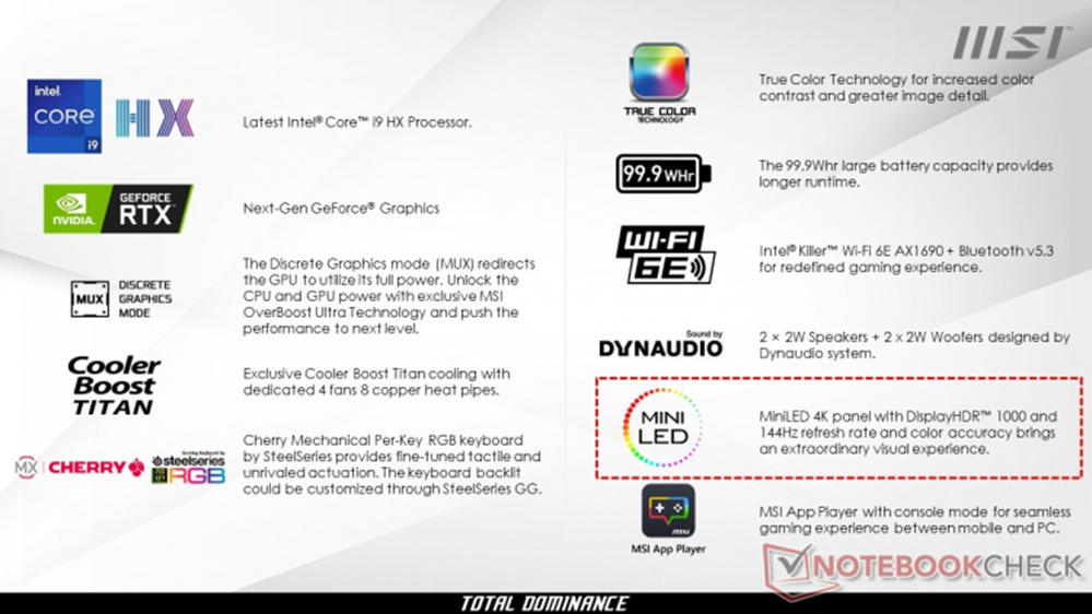 Magdalena Posted December 16, 2022 Posted December 16, 2022 NotebookCheck-ის ინფორმაციით კომპანია MSI გეგმავს Titan GT77 გეიმინგ ლეპტოპის განახლებული და გაუმჯობესებული ვერსიის გამოშვებას - მისი მოდიფიკაციები დამყარებული იქნება CPU Intel Raptor Lake-HX-სა და NVIDIA GeForce RTX 4000 მობილურ ვიდეო ბარათებზე, რომლის ოფიციალური ანონსი მოსალოდნელია იანვრის დასაწყისში დაგეგმილ ღონისძიება CES 2023-ზე. ცნობილია, რომ ახალ Titan GT77-ს ექნება 17.3-დუიმიანი 4K დისპლეი 144 ჰერცი კადრის განახლების სიხშირით და 3 მილიწამი რეაგირების დროით. ეკრანის დამატებით უპირატესობად შეიძლება აღინიშნოს სერტიფიკაცია DisplayHDR1000 და 100%-იანი DCI-P3 ფერთა გამის მხარდაჭერა. შესაბამისად, sRGB 100%-ზე მეტი იქნება. ცნობილია, რომ ლეპტოპის უფროს მოდიფიკაციებში წარმოდგენილი იქნება მობილური პროცესორი Intel Core i9 Raptor Lake. სხვა მნიშვნელოვანი მახასიათებლებიდან აღსანიშნავია გაგრილების მოწინავე სისტემა - მასში მოცემული იქნება ოთხი ქულერი, დიდი რადიატორი და რვა სითბური მილი. CPU-სა და GPU-ის ჯამური TDP-ის დონე 250 ვატს მიაღწევს. ინსაიდერების ცნობით ლეპტოპის ბატარეის მოცულობაა 99 ვტ/სთ, მოწყობილობაში მხარდაჭერილი ექნება Wi-Fi 6E და Bluetooth 5.3, მექანიკური კლავიატურა Cherry MX გადამრთველებით და აუდიო სისტემა Dynaudio, რომელიც წარმოდგენილი იქნება ორი დინამიკითა და საბვუფერით. https://tinyurl.com/3e9tved3 Quote