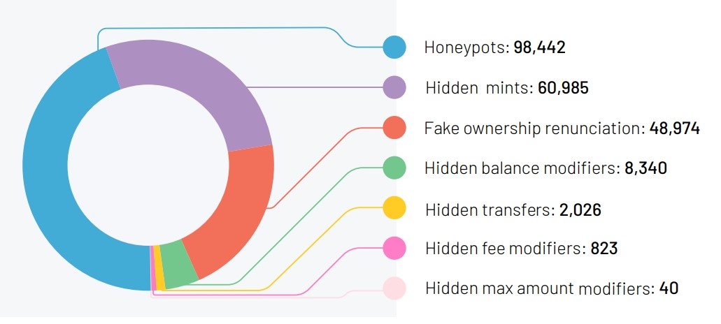 გამოშვებული თაღლითური ტოკენების რაოდენობა თაღლითობის ტიპების მიხედვით. წყარო: Solidus Labs.